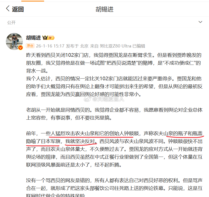 昨天坐车的时候刷微博,看到胡锡进谈西贝事件 这条微博(图1),感觉文风里一股味尤其是这一句话,“一些人猛烈攻击农夫山泉和它的创始人钟睒睒,声称农夫山泉的瓶子和瓶盖隐喻了日本军旗,我就坚决反对”这种污蔑式攻击,他本可不写得这么清楚,他也说了自己反对,但他就是完整地写了出来“隐喻了日本军旗”,好像生怕新读者不知道这种污蔑隐喻似的,这样写,客观上是又一攻对这家企业的污蔑攻击就好比,两位学生吵驾,学生甲骂学生乙T*D,然后老师要求学生甲道歉,学生甲认真地对乙道歉说,“我道歉,我不该骂你T*D,你这么好的人,我当时怎么能骂你T*D呢,我道歉,你左看右看,都不像是T*D~~我道歉,~~”,然后借道歉之名,把T*D这句脏话又重复N多遍老胡这65岁老先生,阴阳怪气这个文风,是改不掉了胡锡进称西贝关店是悲剧,热点观点