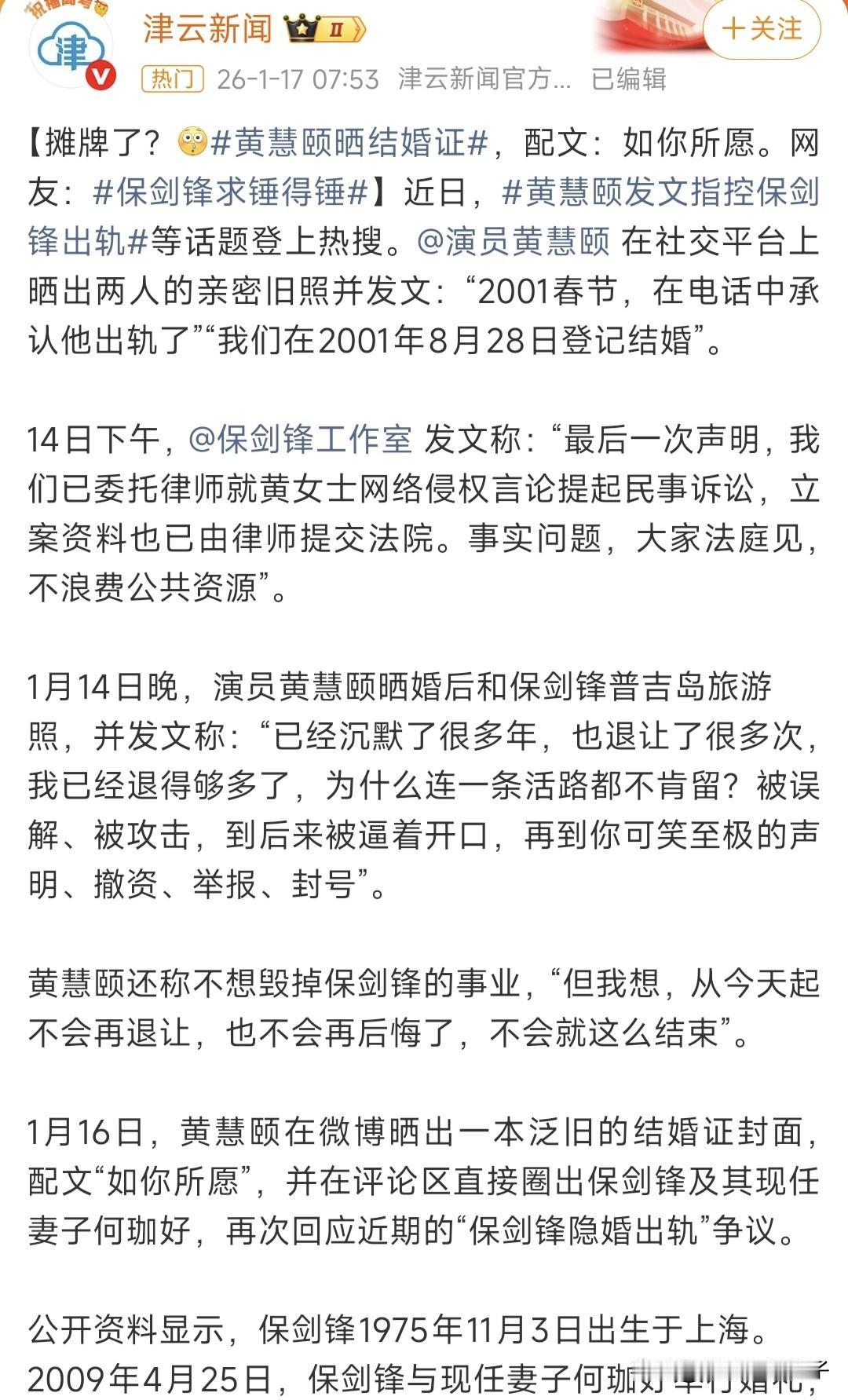 女演员黄慧颐晒结婚证,直接喊话保剑锋何珈好夫妇! 1月16日,晚上,女演员黄慧颐在社交平台发文,称:“如你所愿”,并晒出一张封面略显陈旧的结婚证,看到这里,有些人或许一头雾水,再看评论区,艾特保剑锋何珈,这次直接喊话夫妻二人了。 如果关注此事的网友,一定不会好奇,黄慧颐已经不止一次发文,艾特保剑锋,又是婚后度假照,又是亲密合影,就连结婚证都亮出来了。 有网友觉得,这姐的做法估计打算要鱼死网破了。 不过,结婚证只看到封面,没看到里面的内容,并不能说明什么。 然而,感觉黄慧颐的爆料,每一次都在升级,可能手里真的有点东西。 此前,保剑锋工作室已经回应,对于此事,一切交给法律。可见很有底气。 至于黄慧颐后续会不会放出大招?不得而知,希望大家理性吃瓜。