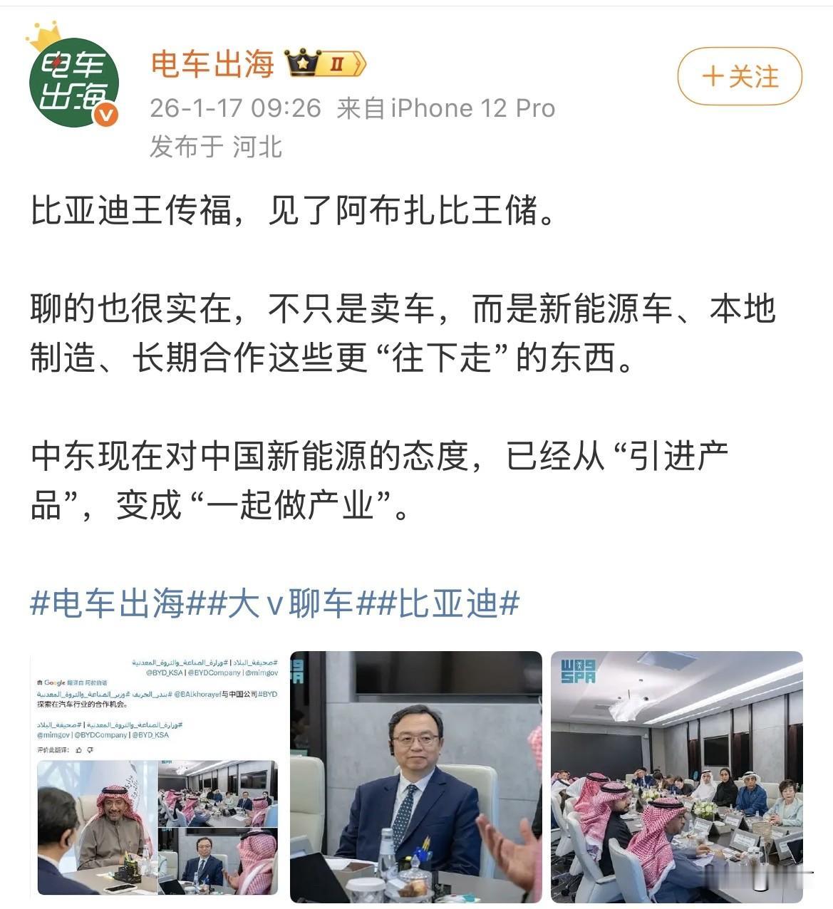 王传福见了阿布扎比王储! 就在刚才,有博主发了比亚迪出海最的新动态,画面当中的王传福,穿着西装打着领带看起来一脸的轻松自如,这次他没坐C位,因为大客户来了! 这次的大客户来自阿布扎比,由于他们说的是本地化,所以可以注意到王传福右侧的耳朵上,带着翻译耳机,他认真地倾听着阿布扎比王储的谈话内容,双方看起来都非常的轻松自在。 这次和以往不同的地方在于,比亚迪不仅仅只是简单地在他们那边卖车,而是要把他们的新能源汽车想办法本地制造,而且长期扩大规模的合作,而比亚迪又是在珠海方面比较有经验的企业。 所以从阿布扎比王储他们的态度,可以看到,中东那边对我们新能源汽车的态度,与以前他们到处买买买不一样,而是真的要把这个新能源,引进到他们那边去 ,变成一个全新的大的产业。 所以这一次出海,对于比亚迪来说,又是一次战略上的升级,不过这种事儿要想完全落地,估计还得几年时间,我们拭目以待。