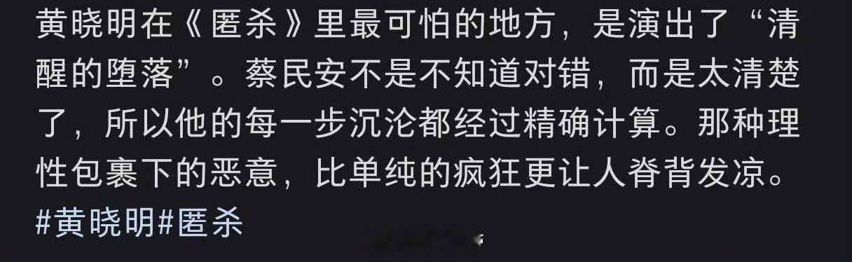 没想到越老实的人下手越狠 黄晓明在《匿杀》里真的杀疯了!前期眼神真挚的蔡明安,转头撕下面具就是一波白切黑的硬核反转,直接惊掉下巴!镜片后的眼神从阴冷飙到癫狂,完全是把疯批反派刻在脸上,这不就是“越老实的人下手越狠”的真实写照吗?都被他骗到了!