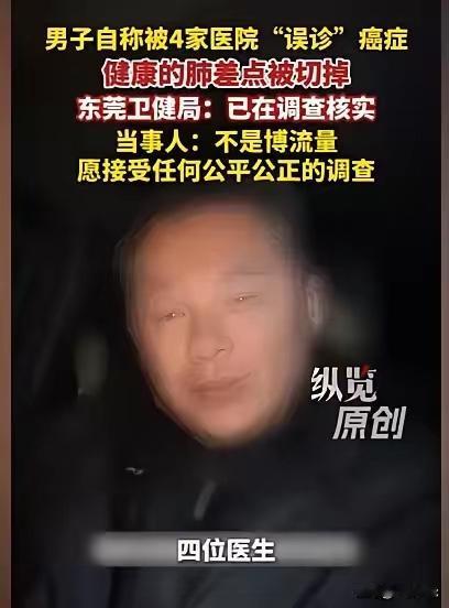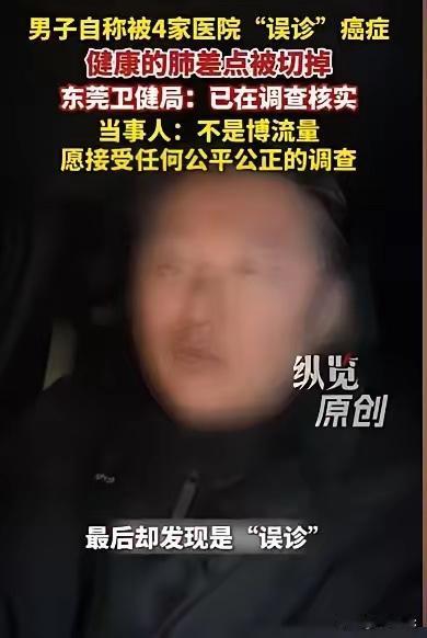 东莞男子自称被四家医院误诊癌症,健康肺险遭切除 广东东莞的这名男子,起初只是因剧烈咳嗽就医,没想到接连在四家医院都被诊断为“恶性肺结节,疑似肺癌”,医生一致要求他立即手术切除病灶。 面对四次相同的诊断结果,他从最初的怀疑、崩溃,到最后无奈接受“癌症”的命运,甚至提前做好了手术的心理准备和后事安排。 就在他躺上手术台的前一刻,一位年轻的助理医生在复查时发现了关键问题——反复比对影像后,确认他的肺部根本没有恶性结节,完全健康。 这个结果让他又哭又笑,既庆幸自己的肺保住了,又愤怒于此前四家医院的误诊。事后他公开质疑:“四家医院的诊断怎么会集体出错?健康的肺差点就被切掉了。” 面对外界“博流量”的质疑,他公开表示愿意接受任何公平公正的调查,只求一个真相。目前东莞卫健局已介入调查核实这起事件,后续进展备受关注。