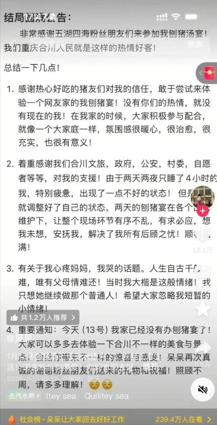 一位在公安局担任政委的学生告诉我说,重庆合川呆呆妹最关键、最厉害同时也是最成功的一招是,及时向公安机关报备了。这就意味着,政府必须为接下来发生的事情兜底负责。 一段仅有十几秒的“杀猪摇人”视频,竟能让你一夜之间面临数千名陌生人即将冲进家门的失控局面,你下意识的第一反应会是什么?是手足无措的惊慌?是赶紧删除视频?还是干脆关机逃避? 但在重庆合川,这位名叫呆呆妹的女孩却做出了一个看似最“笨拙”、实则最精明的决定——她连夜赶赴派出所进行了报备。 一位公安局政委后来复盘时直言,这一招直接将政府力量转化为了她的“后台”,迫使官方必须为后续可能出现的混乱局面进行兜底。这背后究竟隐藏着怎样的生存智慧? 那个深夜里的报备举动,彻底重塑了整个事件的走向。回溯到1月9日凌晨,呆呆妹对着手机镜头随口喊了一句:“谁来帮我按猪”,谁知效应惊人,5个500人的微信群瞬间满员,后台报名表更是排起了千人长龙。 换作常人恐怕早已吓得瘫软,但她所做的第一件事既不是删帖销号,也不是出面道歉,而是直接“杀”进了派出所——将事情的起因经过、预估的人流规模以及可能爆发的隐患,巨细靡遗地全盘托出。 这一动作的战略威慑力究竟有多强?它硬生生将一场极有可能演变为“非法聚集”的闹剧,转化成了政府不得不接管的“公共安全事件”。1月11日凌晨2点,合川文旅局的工作专班已经打着手电摸黑进村了,从指挥车辆停放、协调电力保障、赞助猪源到安排非遗打铁花表演,硬是将一场普通的家庭杀猪宴,升级成了官方背书的乡村文旅嘉年华。 原定计划宰杀的2头猪追加到了5头,交警在村口疏导交通,志愿者端着刨猪汤满场穿梭,运营商甚至直接开来了应急通信车以保障信号畅通。活了大半辈子头一回见杀猪来这么多人,比过年还热闹十倍!庆福村的村干部在现场笑得合不拢嘴,这句感慨道出了现场的空前盛况。 为何仅仅一个报备动作就能让政府全员出动?因为呆呆妹的这一手,等同于将流量风险这颗“不定时炸弹”提前上交给了体制。 她用最质朴的方式完成了一次完美的“责任绑定”——在你完成报备的那一刻,政府的角色就从“事后追责的执法者”转变为了“事前预防的保障方”。倘若没有报备,成千上万的人无序涌入村庄,导致交通瘫痪、垃圾遍野,一旦发生踩踏等安全事故,等待她的将是天价赔偿和法律的严惩。但报备之后,出于维护社会稳定、保障群众安全以及维护地方形象的考量,政府不得不下场接盘。正如呆呆妹事后所言:“还好有相关部门兜底,不然我真扛不住。” 这套逻辑放置在更宏大的维度上审视同样精准。反观隔壁那些爆红后迅速“翻车”的网红,要么是私自组织活动被查处,要么是人员聚集失控被问责,归根结底是因为他们将“流量”视作私人财产,却忽略了它随时可能异化为“公共风险”。 呆呆妹的高明之处,在于她用一纸报备,将这股不可控的狂暴能量装进了制度的安全笼子里。她没有选择对抗规则,而是主动拥抱规则,让政府成为了她的“安全网”而非“绞索”。这也是为什么她能从一个可能被流量反噬的“闯祸者”,华丽转身为合川文旅的“代言人”。 真正值得我们深思的,从来不是她究竟涨了多少万粉丝、收了多少打赏,而是她在面对流量山洪爆发前夕,下意识做出的那个抉择。 当99%的人还在纠结要不要删视频、如何敷衍网友时,她已经跑去派出所完成了风险转移。这碗热气腾腾的“刨猪汤”里最核心的佐料,不是什么秘制配方,而是一份名为“责任共担”的人间清醒。 在这个人人都可能被流量瞬间砸中的时代,敬畏规则、主动沟通、寻求体系保护,才是最长久的“爆红”之道。 那些只顾着盯着流量狂欢,却不懂得给它套上笼头的人,迟早会被这头猛兽反咬一口。 参考:杀年猪女孩“呆呆”3天涨粉200万 村委称无剧本:爆火前其一家人很普通——潇湘晨报