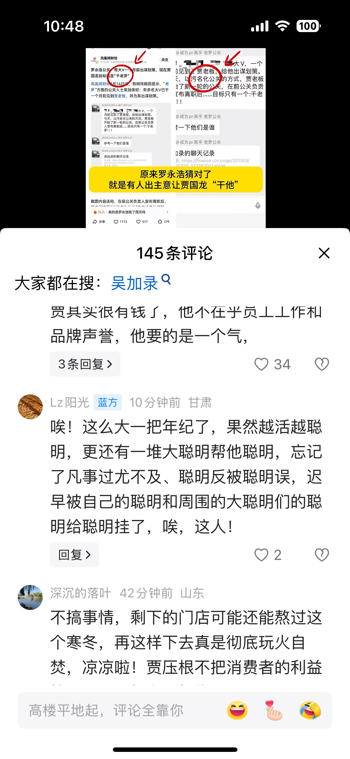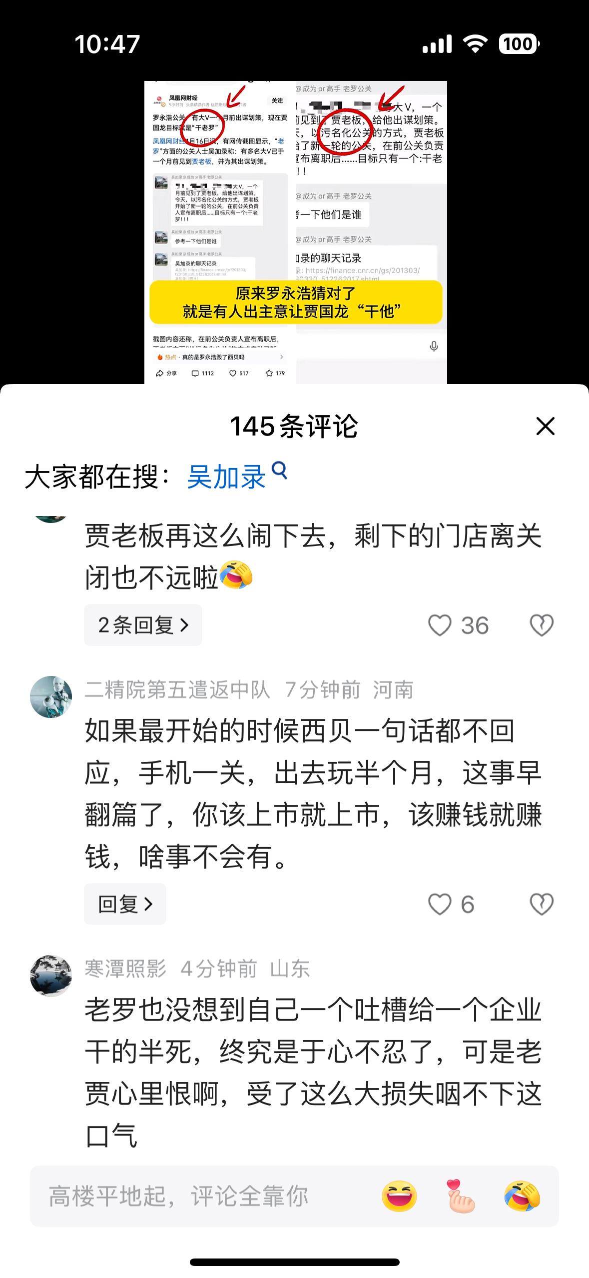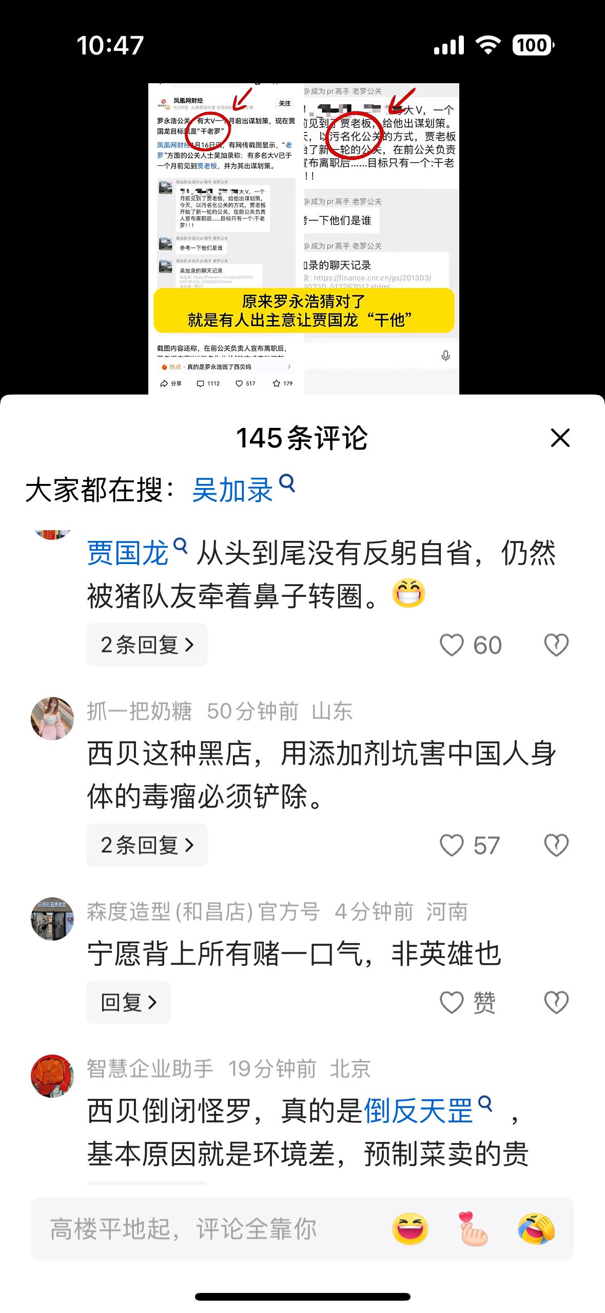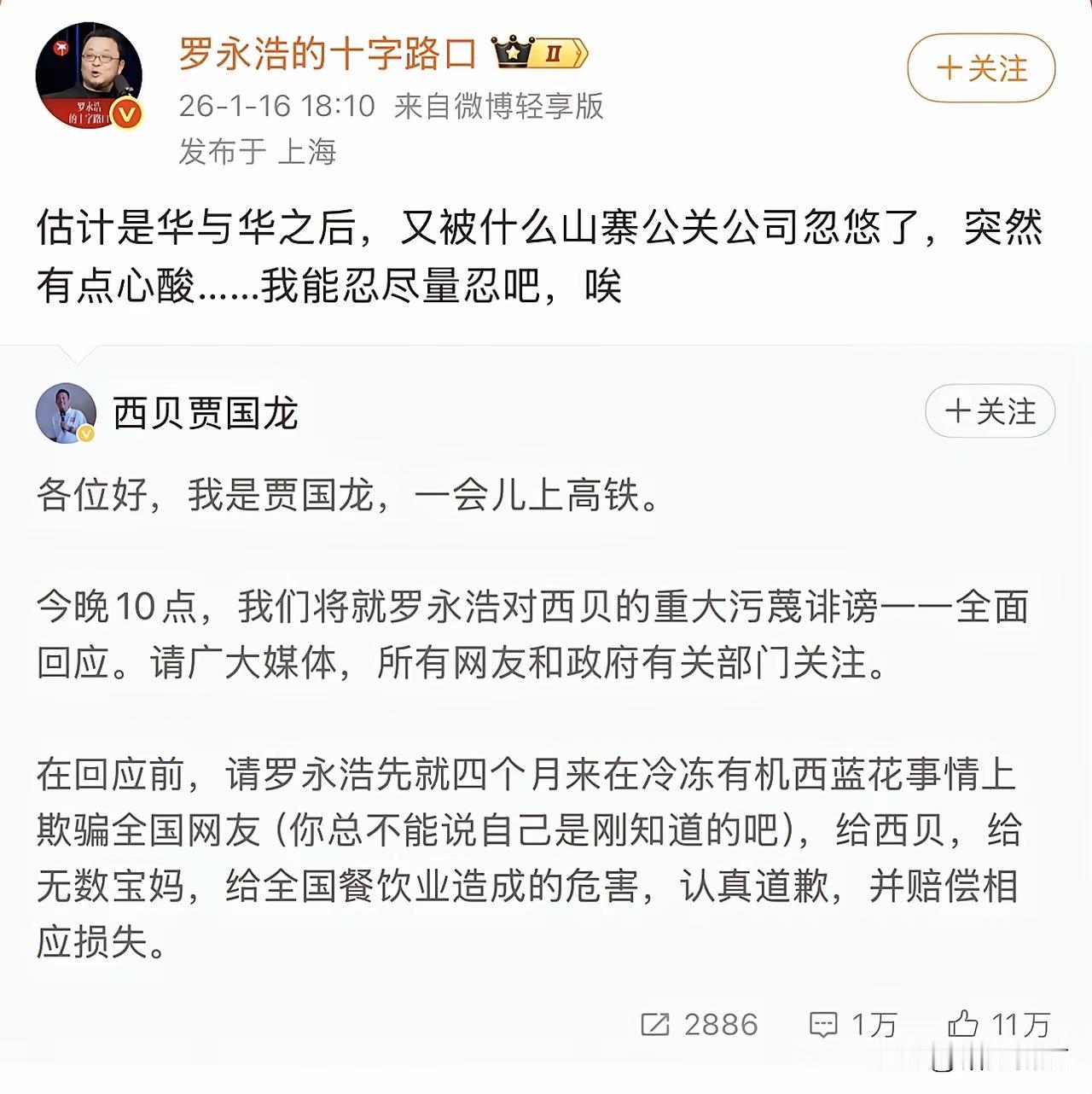 说实话西贝这事,我作为一个吃瓜群众都已经忘了。 现在又有瓜吃了。 有人说,这是西贝贾国龙自己给自己捅刀子。 咱也不懂,反正,有瓜就吃呗。 看到网上的截图,罗永浩说忍了,贾国龙说,千万别忍。 这是宣战书吗? 有懂的吗? 还有最新消息没有?