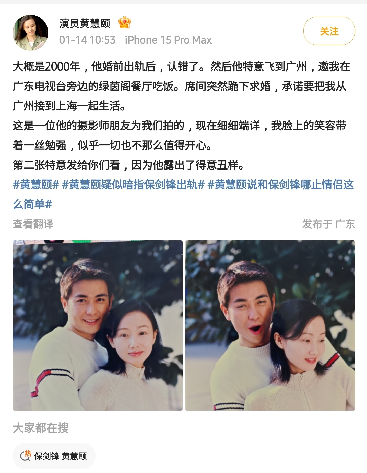 娱乐圈热闹了,黄慧颐直接甩结婚证,配文“如你所愿”艾特保剑锋和他现任何珈好,爆料2001年隐婚。 编剧汪海林补刀,2002年拍剧时,保剑锋被女友捅了一刀,就因为没接电话,疑似就是黄慧颐!一边是黄慧颐哭诉说二十年委屈,一边是保剑锋工作室发声明起诉,这瓜越吃越迷!咱就是说,不管谁对谁错,二十年的私事就不能私下解决吗?公开喊话艾特现任、甩证据引舆论,这不就是拉网友站队威胁人吗?真的太不妥了!感情里的恩怨是非只有当事人清楚,把家丑摆到台面上撕,难看又掉价,还让吃瓜群众跟着站队互骂,实在没必要啊!