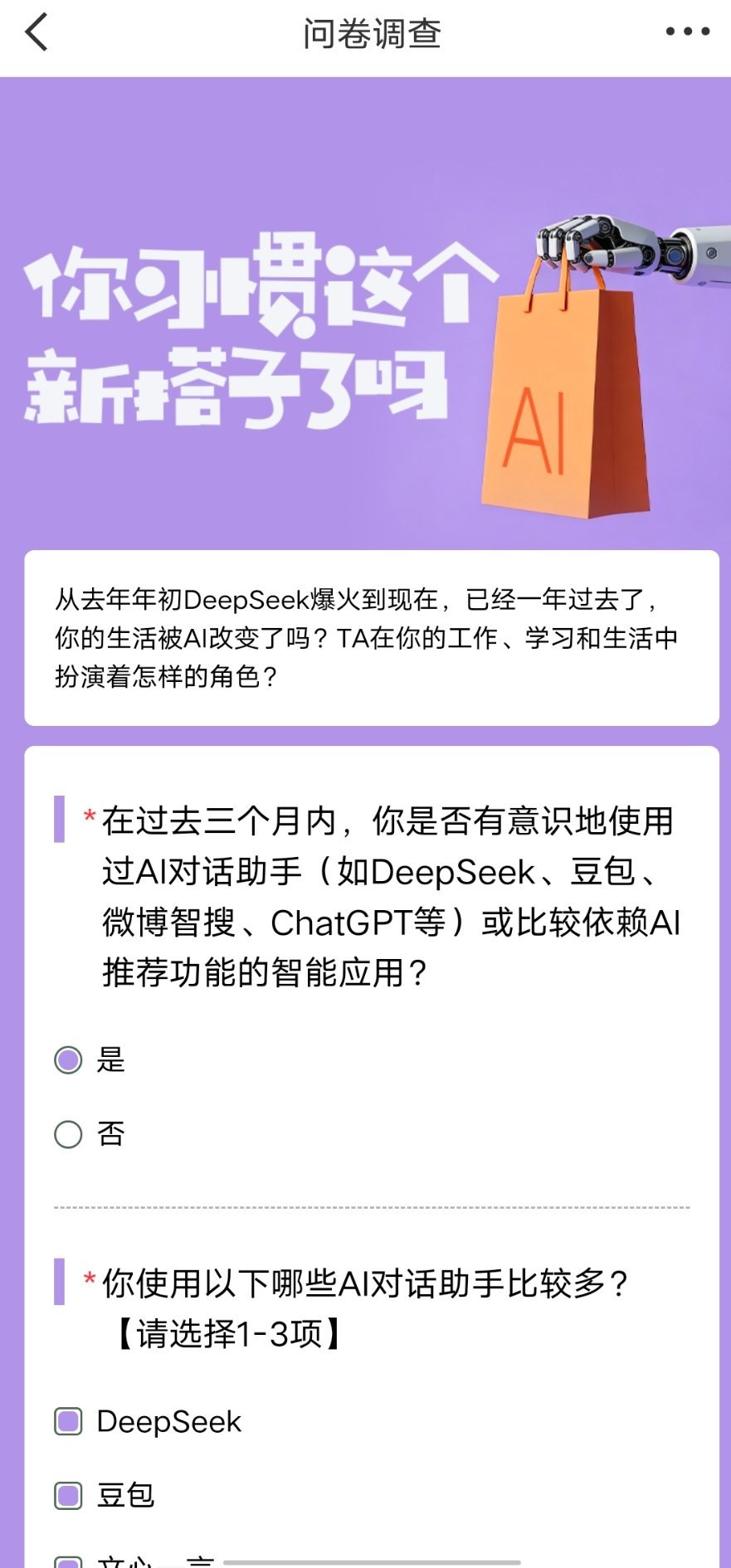 你习惯这个新搭子了吗 😲一年过去,AI已悄然重塑我的生活!从去年年初DeepSeek爆火,像一颗投入平静湖面的巨石,激起AI领域的千层浪,到现在已经过去整整一年啦🤔。这一年,AI不再只是科技新闻里的遥远概念,而是真真切切地走进了我的生活,在工作、学习和日常的方方面面都留下了它的足迹👣。今天就来和大家好好唠唠,AI到底给我的生活带来了哪些改变🧐。------💼工作:AI是我的得力小助手工作中,AI简直是我的救星🌟。我是一名文案策划,每天都要和文字打交道,绞尽脑汁想创意、写文案。以前,写一篇高质量的文案,从构思到成稿,常常要花费我好几个小时,还经常因为灵感枯竭而抓耳挠腮😣。自从有了AI写作工具,一切都变得不一样了😎。我只需要输入一些关键词和基本要求,它就能在短时间内生成一篇结构完整、内容丰富的文案初稿。虽然有时候生成的文案还需要我进行一些修改和润色,但大大节省了我的时间和精力,让我有更多的时间去思考创意和优化细节🤗。而且,AI还能帮我进行市场调研和数据分析📊。在策划一个项目之前,我会用AI工具收集相关的市场信息和用户反馈,它能够快速整理和分析大量的数据,为我提供有价值的参考,让我的策划方案更加精准和有针对性🎯。📚学习:AI是我的专属小老师在学习上,AI也给了我很大的帮助👏。我一直在学习英语,但是口语一直是我的短板😫。后来我发现了AI语言学习工具,它就像一个随时陪伴在我身边的口语老师👩🏫。我可以和它进行实时对话练习,它会根据我的发音和表达给出及时的反馈和建议,帮助我纠正错误,提高口语水平🗣️。而且,它还能提供丰富的学习资源,比如英语电影、新闻、小说等,让我在轻松愉快的氛围中学习英语🥰。除了语言学习,AI还在其他学科的学习中发挥了重要作用🧐。当我遇到难题时,我会用AI解题工具拍照搜索,它会给出详细的解题步骤和思路,让我能够快速理解问题并掌握解题方法💡。🏠生活:AI是我的贴心小管家在日常生活中,AI也无处不在🤳。我家里安装了智能语音助手,只需要一声指令,它就能帮我控制家电设备、查询天气信息、播放音乐等🎶。早上醒来,我对它说一声“打开窗帘”,窗帘就会自动拉开,让阳光洒进房间;晚上睡觉前,我对它说一声“关闭灯光”,房间里的灯就会全部熄灭,非常方便😌。还有智能健康监测设备,它能够实时监测我的身体状况,比如心率、睡眠质量等,并将数据同步到我的手机上📱。通过分析这些数据,我可以了解自己的健康状况,及时调整生活方式和饮食习惯,保持身体健康💪。------这一年,AI已经成为了我的工作伙伴、学习老师和生活管家🥳。它让我的生活变得更加高效、便捷和有趣。你呢,你的生活被AI改变了吗?快来评论区分享你日常都在用什么AI工具以及用它们来做什么吧👇!让我们一起拥抱AI时代,开启更加美好的未来🌈!
