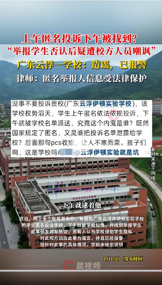 近日,网上多个账号发文称,有疑似广东云浮市伊顿实验学校的学生匿名投诉学校,下午就被学校得知,并找到举报学生,事件引发网友热议,另有人认为学校侵犯学生隐私。