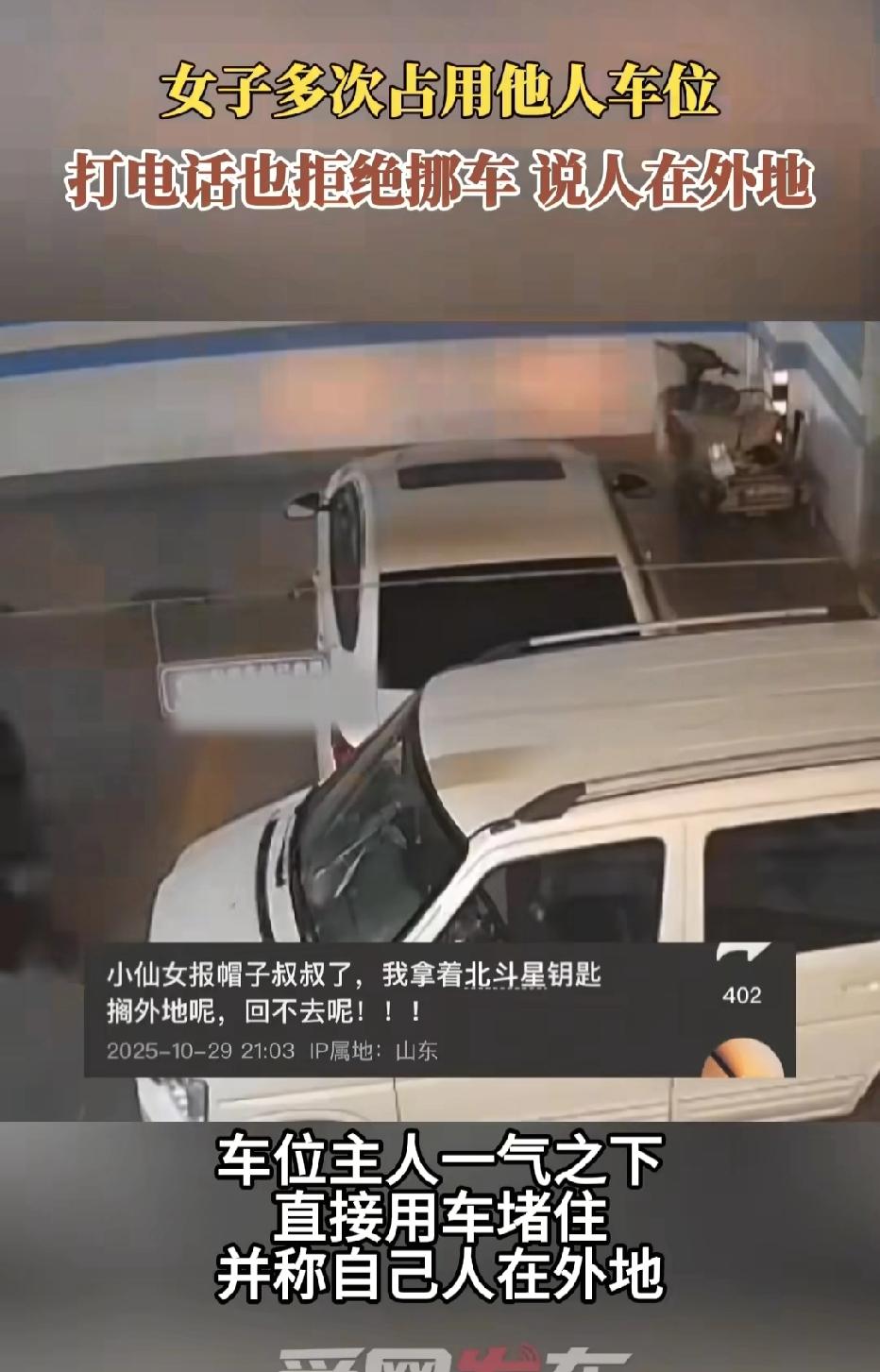 山东,女子经常占用别人家车位,一停就是一天一夜,车位主人打电话叫挪车,不料,女子却说自己在外地,第二天,女子还是将车子停在原地,又找了同样借口拒绝挪车,车位主人气得将自己的车子堵在外面3天。女子报警,车位主人称自己在外地,无法挪车。女子只好请人帮忙将车开走。 女子一脸紧张地看着自己的车子被堵在原地,动弹不得。 她现在体会到了自作自受的感觉,谁让她无理占用别人的车位呢。 女子满脸憋屈地指挥着拖车师傅,将自己被堵了三天的车挪走。 事情是这样的,女子每次开车到地下车库,看到车位停满了,她发现有一处空位,总是不管三七二十一就将车子停在别人的车位上。 她完全没有把车位主人放在眼里。一停就是一天一夜。 原车位主人这次出差回家,发现车位被霸占了,于是打电话让对方挪车。 不料,女子不仅不挪车,却称自己人在外地,说完就挂了电话,一副你自己看着办。 原车位主人很郁闷,心里堵得慌,这算哪门子道理? 私人车位可不是白来的,自己花钱买的地方,难道还要迁就一个乱停车的人? 不行,必须立个规矩,不然以后这种糟心事只会没完没了! 他兜兜转转二十分钟才找到的临时角落停车,憋着一股气,无处可发。 不成想,第二次,女子还是将车子又停在原车位主人那里。 原车位主人这下总算找到了出气口,直接打电话叫对方挪车。 但女子这一次借口找得振振有词,我真在外地,你别催了行不行? 原车位主人也不想忍了,自己有车位不能停,太憋屈了,他不想惯着对方,决定以其人之道还治其人之身。 他将自己的车子停在女子车前面,就离开了。 等女子想要将车开走时,她犯了难,左边是车,右边是车,前边是墙,后边是车,她的车子开不出去了。 这下戏剧性的一幕出现了。轮到女子打电话给车位主人,希望他下来挪车。 但遭到了车位主人的拒绝,称自己忙呢,没空。 女子表示很委屈,打电话报警,控诉对方故意堵路。 民警联系上车位主人时,他慢悠悠地复述了女子当初的话: 我现在人在外地,得好几天才能回来。她占我车位的时候,怎么没想过别人有没有急事? 这话让民警都哭笑不得,只能劝女子:这事是你先不对,还是自己想办法吧。 女子这下崩溃了,自己的车停在车库三天了,特别影响自己的出行。 没办法,她趁着左边没车的时候,她满脸憋屈地指挥着拖车师傅,一点一点挪动自己被堵了三天的车,生怕刮蹭到旁边的车辆。 费了一番苦功夫,总算将车子开了出去。  《民法典》物权保护规定,私人的合法财产受法律严格保护,禁止任何组织或个人侵占、破坏 。 原车主享有排他的所有权和使用权,属于合法私有财产。 女子未经同意擅自占用,且多次长时间停放,明显侵犯了原车主的物权,原车主有权要求其排除妨害、挪车并赔偿额外停车等损失。 有人认为,这才是对无赖最有效的教育!自己花钱买的车位,凭什么要迁就乱停车的人?她撒谎说在外地的时候,怎么没想过别人的难处? 作为被占过3次车位的人,太懂这种憋屈了!报警人家说管不了,物业只会和稀泥,车主这么做虽然激进,但真的是没办法的办法。 不过也有人表示,解气归解气,还是有点风险。万一对方车子被刮蹭,或者影响其他业主通行,车主反而要担责。建议装个智能地锁,从根源上解决问题。 对此,你怎么看?