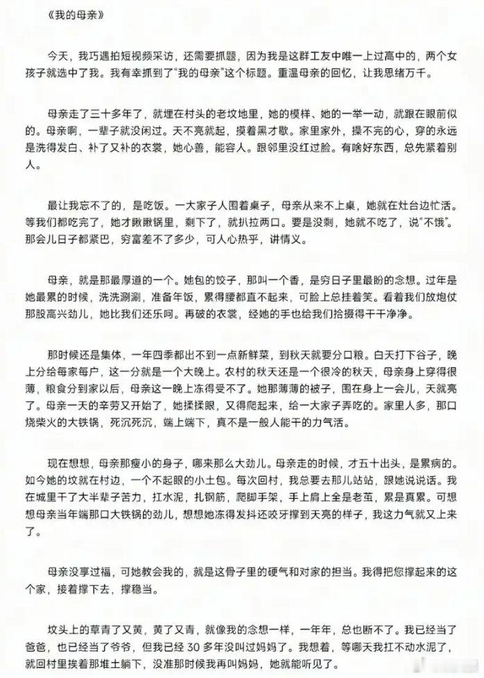 写我的母亲感动全网大爷受邀看春晚 全网都在为安大爷开心!去年因《我的母亲》刷屏的山西农民工安三山,喜提马年春晚彩排邀请函,即将奔赴北京的春晚现场,还现场挥毫送上 “马年大吉,马上发财” 的书法祝福,这份新年美好必须接住!