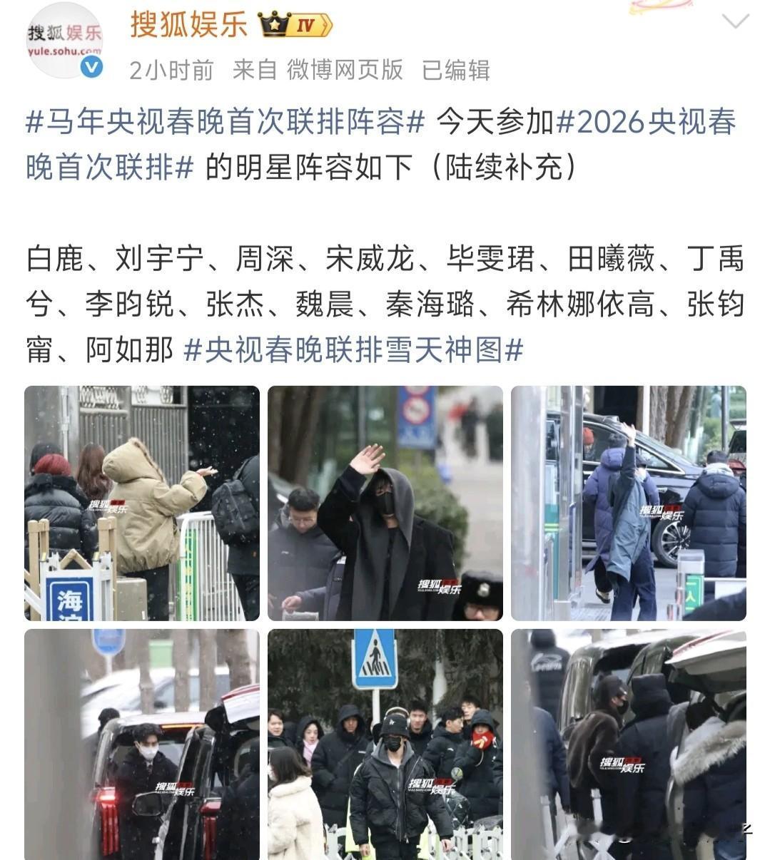 有点担心,春晚首次联排,目前还没看到沈腾和马丽的身影! 1月17日,央视马年春晚开始进行了第一次大联排,很多媒体很早就到大楼前等待,天空飘着雪,拍到很多现场照片,别有一番风景。 截止发文,看到了白鹿、田曦薇、魏晨、刘宇宁、宋威龙、李昀锐、丁禹兮、张杰、周深、秦海璐等艺人的身影。 有点担心,画面中,没有看到沈腾和马丽的身影,不过,昨日,参加了彩排,当然,联排还在进行,或许安排在比较晚的时间。 咱就说,岳云鹏已经确认缺席春晚,语言类节目,也就只能期待沈腾马丽了,可别出什么差错呀! 今年,除了周深,张杰这样的实力歌手,还看到了一些新面孔。 大家一起期待吧!