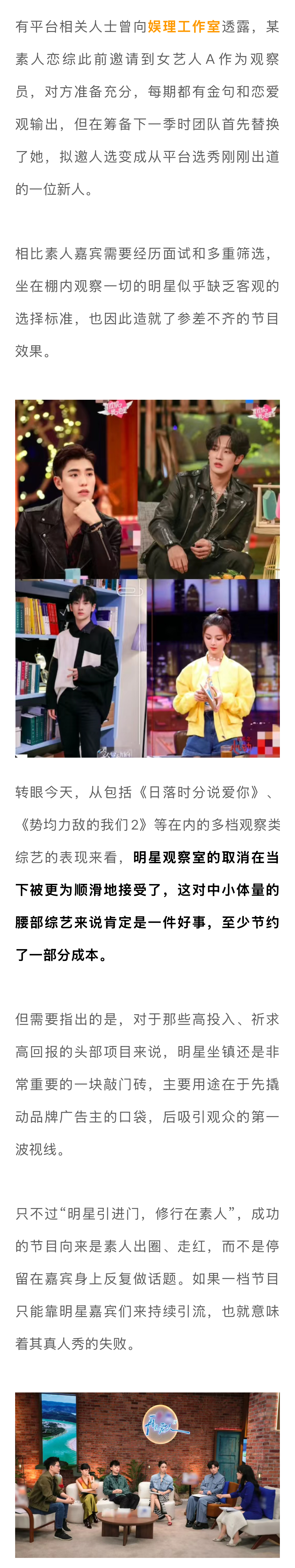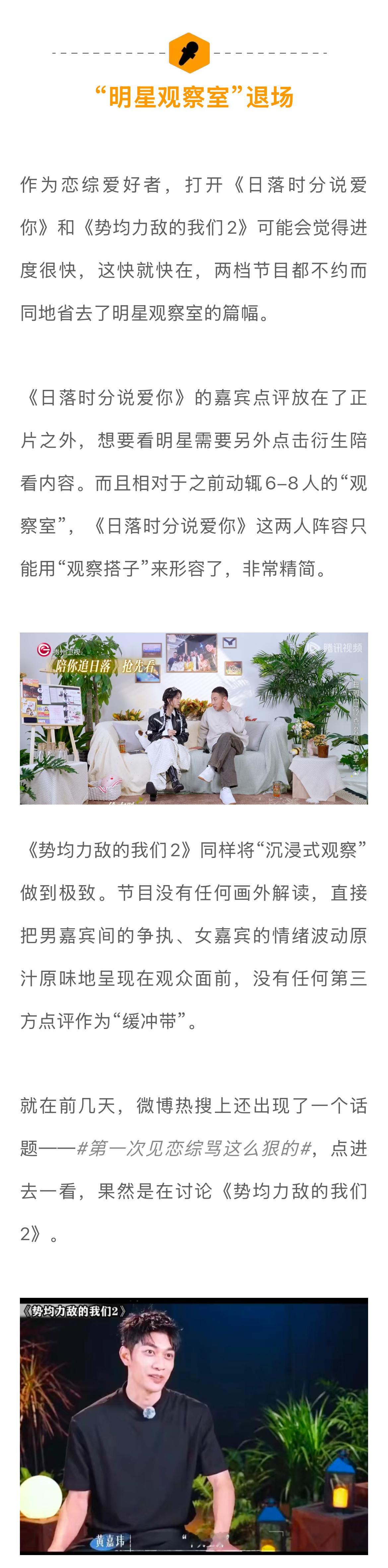 中老年恋综一分钟800个心眼子恋综正在抛弃明星观察员 几年前,行业里还曾传出观察类综艺“或将调整明星观察员的比例”,摆脱对明星的依赖,一时让“明星观察员是不是鸡肋”成为焦点。如今的多档综艺正在践行:《日落时分说爱你》的嘉宾点评放在了正片之外,想要看明星需要另外点击衍生陪看内容。《势均力敌的我们2》没有任何画外解读,直接把男嘉宾间的争执、女嘉宾的情绪波动原汁原味地呈现在观众面前,没有任何第三方点评作为“缓冲带”。在新浪娱乐工作室看来,从多档观察类综艺的表现来看,明星观察室的取消在当下被更为顺滑地接受了,这对中小体量的腰部综艺来说肯定是一件好事,至少节约了一部分成本。但对于那些高投入、祈求高回报的头部项目来说,明星坐镇还是非常重要的一块敲门砖。只不过一档节目如果只能靠明星嘉宾们来持续引流,也就意味着其真人秀的失败。此外从整体来看,一些综艺中嘉宾年龄层和情绪上的变化,本质是恋综从提供浪漫模板向呈现真实社交样本的转型。中年嘉宾的“算计”源于对晚年生活的务实考量,年轻嘉宾的贴脸开大源于社交经验的青涩与直接。这种真实感,也让恋综的社会观察价值进一步提升,不再局限于制造一场充斥着粉红泡泡的“完美恋爱”。但制作端也需要把控抓马、狗血和真实感之间的分寸,不能唯话题论,毕竟“社会性死亡”太多,谁还来敢展现真实?娱理独家↓