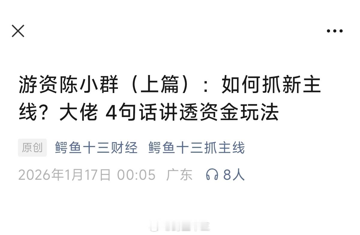 陈小群游资陈小群(上篇):如何抓新主线?大佬 4句话讲透资金玩法。文章放后花园了,赶快去读读。陈小群的水平极菜,你们去看一下我说的胜率是多少,可能还不如你踏空这个词就是个陷阱,股市一直有机会,不存在踏空一说,让自己的账户一直向上没有回撤才是最重要的,不要想一口吃成胖子,到手的利润才是自己的