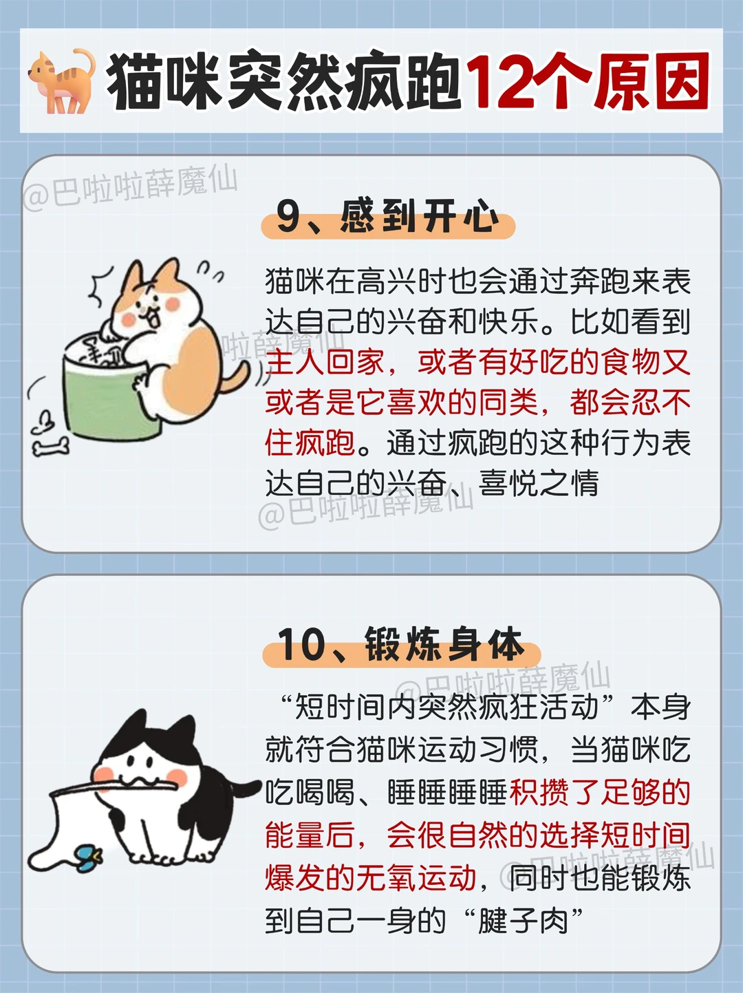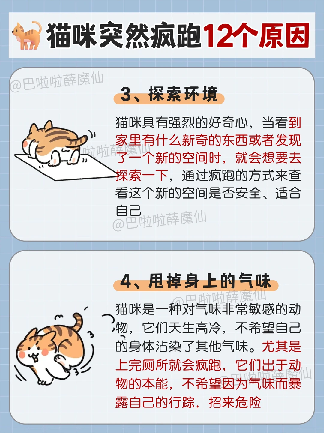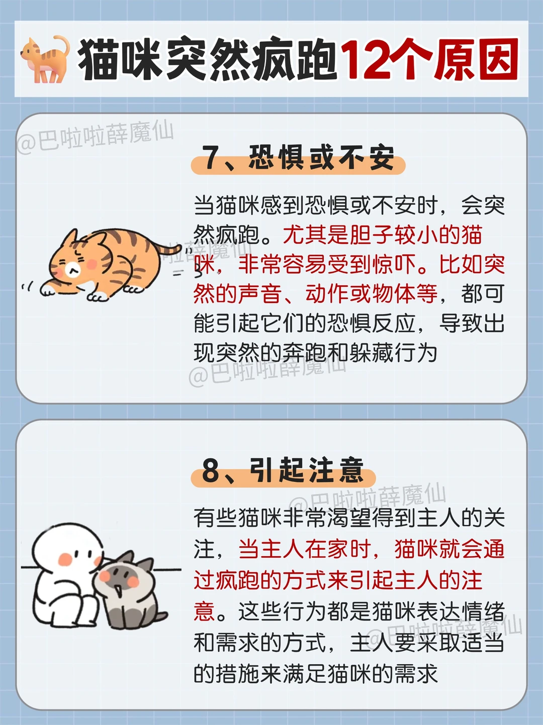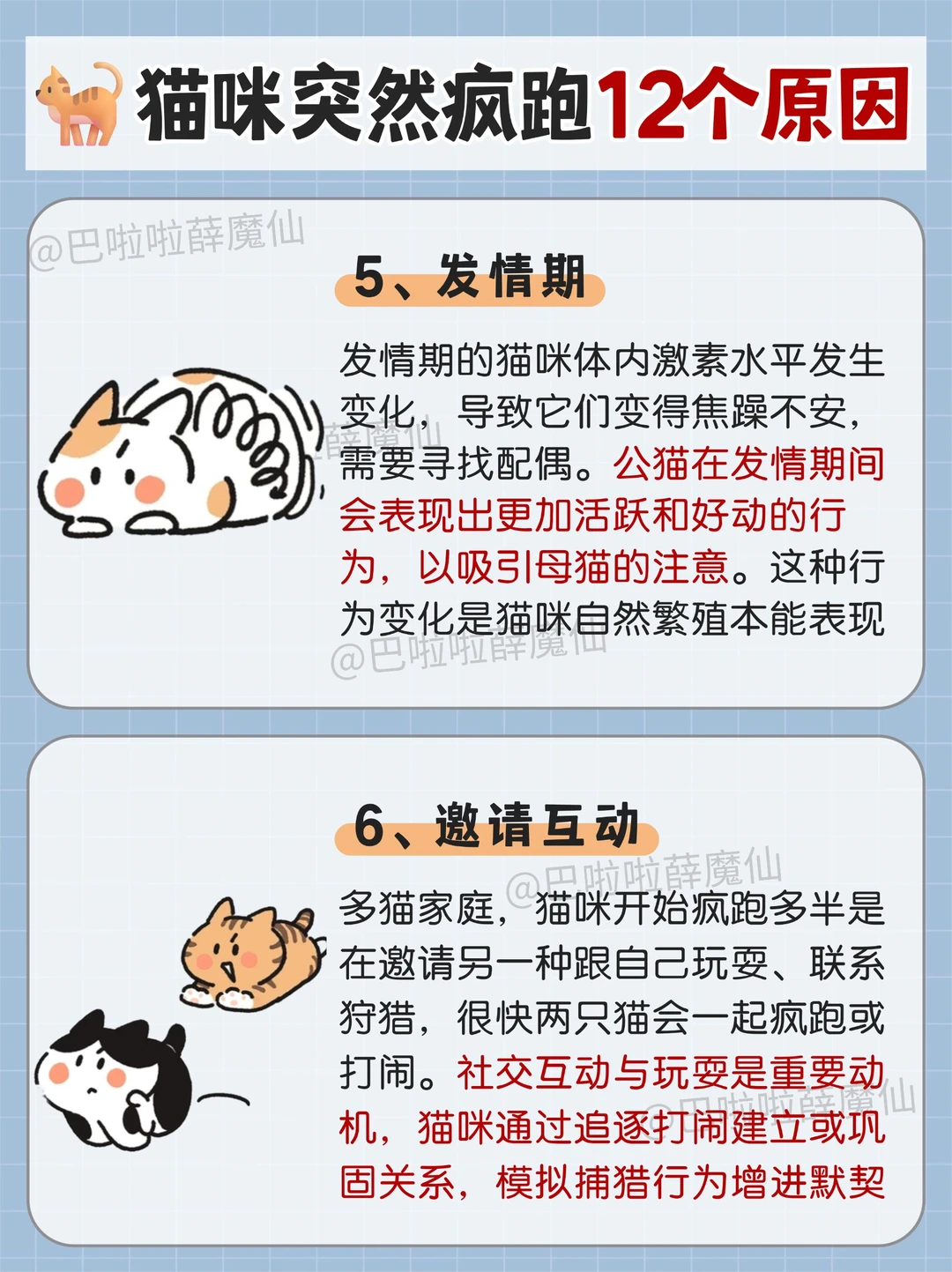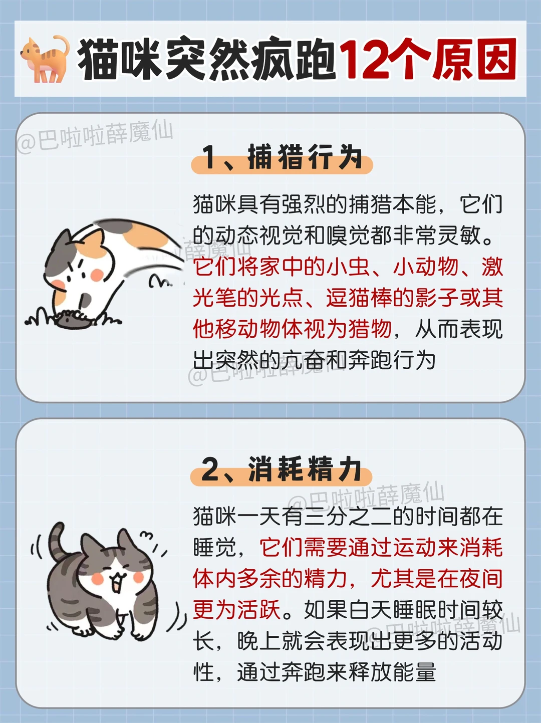 🙋‍♀️大部分养猫人,应该都见过自家猫咪突然间的发疯跑酷吧!👉猫咪来回疯跑有以下几种原因: [一R]捕猎行为 猫咪将家中的小虫、小动物、激光笔的光点、逗猫棒的影子或其他移动物体视为猎物,从而表现出突然的亢奋和奔跑行为 [二R]消耗精力 猫咪一天有三分之二的时间都在睡觉,它们需要通过运动来消耗体内多余的精力,尤其是在夜间更为活跃,通过奔跑来释放能量 [三R]探索环境 猫咪具有强烈的好奇心,当看到家里有什么新奇的东西或者发现了一个新的空间时,就会想要去探索一下 [四R]甩掉身上的气味 尤其是上完厕所就会疯跑,它们出于动物的本能,不希望因为气味而暴露自己的行踪,招来危险 [五R]发情期 发情期的猫咪体内激素水平发生变化,导致它们变得焦躁不安,需要寻找配偶。公猫在发情期间会表现出更加活跃和好动的行为,以吸引母猫的注意 [六R]邀请互动 社交互动与玩耍是重要动机,猫咪通过追逐打闹建立或巩固关系,模拟捕猎行为增进默契 [七R]恐惧或不安 胆子较小的猫咪,非常容易受到惊吓。比如突然的声音、动作或物体等,都可能引起它们的恐惧反应,导致出现突然的奔跑和躲藏行为 [八R]引起注意 有些猫咪非常渴望得到主人的关注,当主人在家时,猫咪就会通过疯跑的方式来引起主人的注意 [九R]感到开心 猫咪在高兴时也会通过奔跑来表达自己的兴奋和快乐。比如看到主人回家,或者有好吃的食物又或者是它喜欢的同类,都会忍不住疯跑 [一R][零R]锻炼身体 “短时间内突然疯狂活动”本身就符合猫咪运动习惯,当猫咪积攒了足够的能量后,选择短时间爆发的无氧运动,同时也能锻炼到自己一身的“腱子肉” [一R][一R]心理压力太大 猫咪产生情绪问题,心理压力太大,会感到焦虑、害怕、不安等,当猫咪无法宣泄这种情绪的时候,就会通过疯跑来发泄 [一R][二R]环境变化 突然的环境变化,如家中装修、搬家或有陌生人来访,引起猫咪的紧张感和不安全感,疯跑来应对这种不安 - ✅猫咪在家疯跑,主人要做好以下四件事 1️⃣提供充足的游戏时间 2️⃣创造有趣的环境 3️⃣确保安全 4️⃣观察社交动态