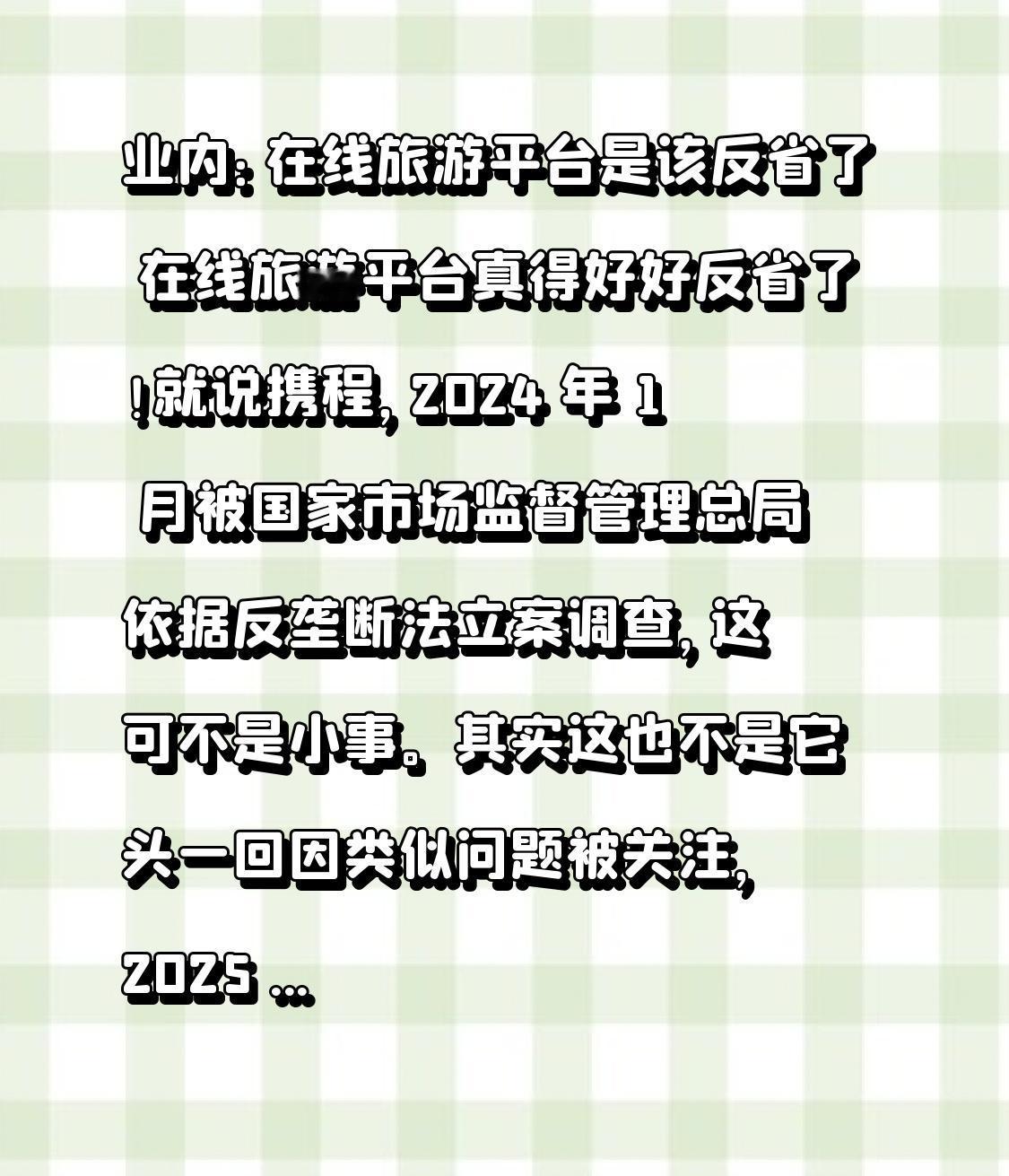 业内:在线旅游平台是该反省了 在线旅游平台真得好好反省了!就说携程,2024 年 1 月被国家市场监督管理总局依据反垄断法立案调查,这可不是小事。其实这也不是它头一回因类似问题被关注,2025 年地方监管部门多次约谈它,像贵州、郑州等地都指出其存在“二选一”、干预商家定价等问题。 除了垄断问题,线上购票陷阱也不少。暑期张女士在小程序买恭王府和天坛公园门票,价格比官方贵很多,还捆绑讲解、园中园门票。官方小程序就清晰明了。在线旅游平台该好好改改,给游客一个靠谱的环境了。