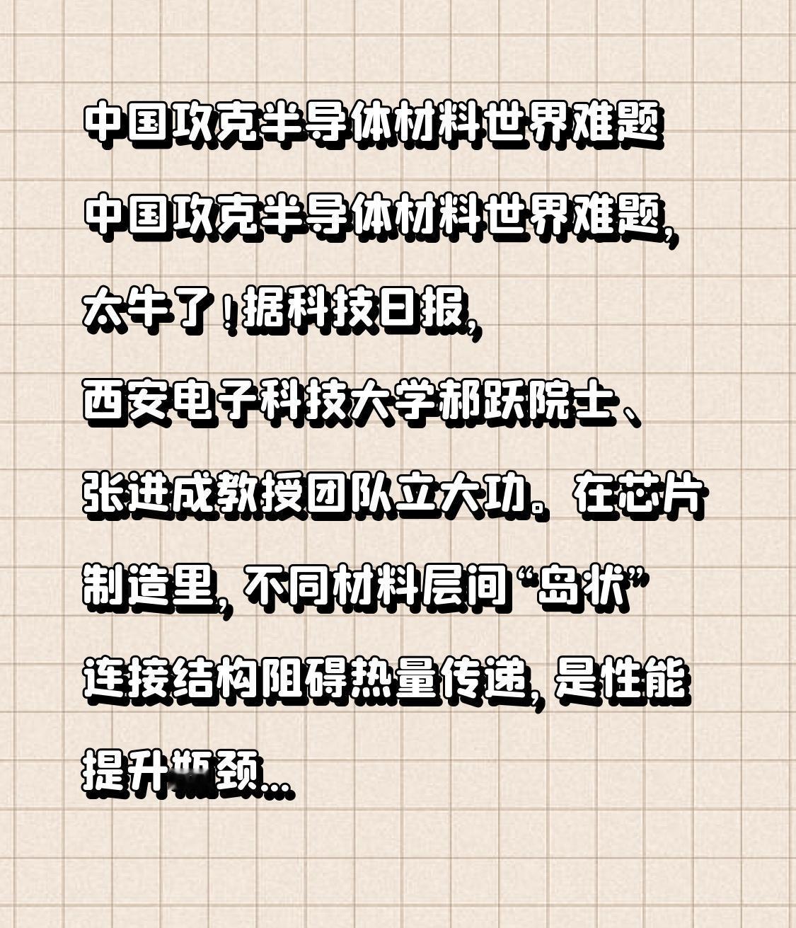 中国攻克半导体材料世界难题 中国攻克半导体材料世界难题,太牛了!据科技日报,西安电子科技大学郝跃院士、张进成教授团队立大功。在芯片制造里,不同材料层间“岛状”连接结构阻碍热量传递,是性能提升瓶颈。这个问题从2014年相关成核技术获诺贝尔奖后就没解决。 团队首创“离子注入诱导成核”技术,把“岛状”界面变成原子级平整“薄膜”,新结构界面热阻仅为传统的三分之一。基于此技术的氮化镓微波功率器件,输出功率密度将国际纪录提升30% - 40%。相关成果发表在顶级期刊,给半导体材料集成提供了“中国范式”,这突破太关键了!