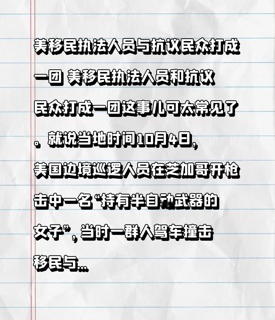 美移民执法人员与抗议民众打成一团 美移民执法人员和抗议民众打成一团这事儿可太常见了。就说当地时间10月4日,美国边境巡逻人员在芝加哥开枪击中一名“持有半自动武器的女子”,当时一群人驾车撞击移民与海关执法局的车辆,之后当地民众和执法人员紧张局势升级,执法人员直接发射胡椒喷雾、橡胶子弹和催泪瓦斯。 还有19日,在芝加哥市郊移民拘留中心外,双方又起冲突,执法人员扔催泪瓦斯。自本月8日移民执法局在伊利诺伊州行动以来,已在芝加哥抓了近550人。这冲突不断,白宫还打算派国民警卫队,看来这乱子一时半会儿是停不了。