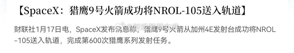 火上浇油!火上浇油!商业航天周末再迎来大利好消息预计商业航天板块有望再次起飞了…下午4点27分,SpaceX发布重磅利好消息了,猎鹰9号火箭成功将NROL-105送入轨道,圆满取得成功,这个消息一出,满仓商业航天的股民们,乐开花了,SpaceX 刚刚成功完成的这次发射,这确实是一个非常重磅的消息!不仅是技术上的胜利,更像是一针强心剂,这证明了商业航天可以像工业流水线一样进行高频次、标准化的作业,对于资本市场来说,这意味着商业模式是跑得通的,不再是单纯的烧钱概念,而是具备了产生稳定现金流的能力产业,这给全球商业航天板块注入了极大的信心 ,总而言之,这次发射成功也是对国内商业航天板块中长期发展逻辑的极大强化,对于商业航天又是一大利好催化剂,是重大利好消息股民们!坐稳扶好!受此利好消息刺激,预计下周一商业航天要大反攻了,有望大爆发!恭喜还满仓的,准备吃大肉了!股票