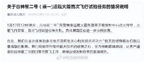 1月17日12时08分,谷神星二号民营商业运载火箭在酒泉卫星发射中心点火升空,火箭飞行异常,首次飞行试验任务失利。具体原因正在进一步分析排查。