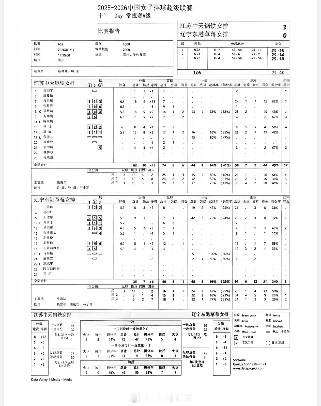 【技术统计】排超联赛第10轮,江苏女排3比0辽宁女排(25-16 25-14 25-18)排超联赛2025-2026中国排球超级联赛