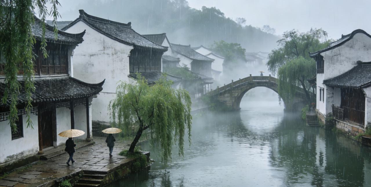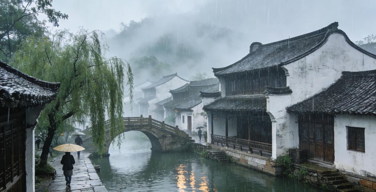 《烟雨江南》美图简介 细雨如丝,晕染出一幅朦胧的江南水墨画。白墙黛瓦的古宅依水而建,乌篷船静卧在泛着涟漪的河道上,石拱桥在雨雾中若隐若现。垂落的柳丝沾着晶莹的雨珠,与湿润的青石板路相映成趣。 远处的青山被薄雾轻裹,近处的檐角滴着水珠,整个古镇仿佛浸在温润的水汽里。没有喧嚣,只有雨打芭蕉的轻响,和行人撑伞走过的悠然身影。这幅图将江南的温婉、静谧与诗意凝于一瞬,让人在朦胧烟雨中,读懂水乡独有的温柔与绵长。