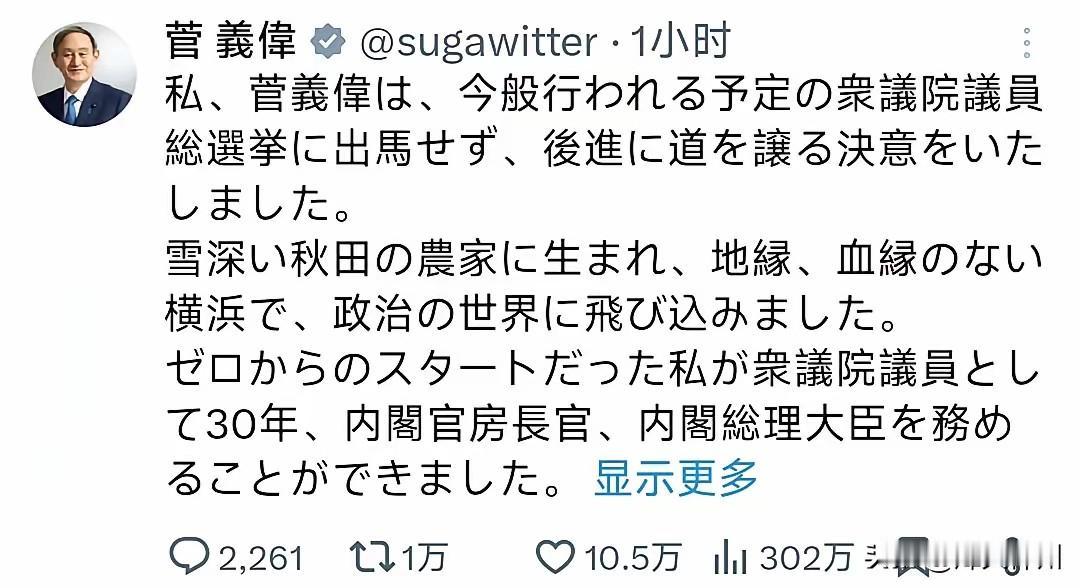77岁菅义伟突然隐退!没派系没靠山,草根首相的政坛梦碎了 1月17日,77岁的日本前首相菅义伟通过社交媒体宣布退出众议院大选、彻底隐退政坛,以“体力不支”的体面说辞,为自己28年的政治生涯画上句号。 这位从秋田农家走出的“令和大叔”,其逆袭与陨落的轨迹,简直是日本政坛派系政治的真实写照。 菅义伟的政治起点堪称草根传奇。无显赫家世、无派系依托,他从议员秘书起步,凭借勤恳务实的作风成为安倍晋三最信赖的“大管家”,以7年8个月的任职纪录创下日本宪政史上最长官房长官任期。 2020年安倍突然卸任后,他以无派系身份逆势当选首相,成为战后首位“草根首相”,一度被视作打破世袭政治的希望。执政期间,他推动设立数字厅、创设“故乡税”制度、敲定“2050碳中和”目标,不乏务实举措。 但缺乏派系根基的短板终究难以逾越。新冠疫情应对摇摆、东京奥运会强行举办引发民怨,让内阁支持率跌破30%红线,使其成为战后任期最短的首相之一。 而2022年安倍遇刺,更是让他彻底失去权力靠山。在岸田文雄执政后派系重新洗牌的格局中,无派系支撑的菅义伟沦为“局外人”,既无法左右政策走向,也难以凝聚选举力量,“体力不支”不过是其认清现实后的体面托词。 菅义伟的隐退,标志着日本无派系政治路线的又一次挫败。对比麻生太郎等前首相卸任后仍能凭借派系影响力左右政坛,他的黯然离场深刻印证:在自民党体系中,派系才是权力的硬通货,单靠一个靠山根本站不稳脚跟。 这不仅巩固了岸田文雄的执政地位,更让日本政坛的“世袭”色彩愈发浓厚——草根逆袭的通道收窄,政治家族与派系传承的格局进一步固化。 从公布“令和”年号的高光时刻,到黯然隐退的落寞背影,菅义伟用一生书写了日本政坛的无奈:个人努力能攀登权力巅峰,却难以撼动固化的体制。他的悲情终章,不过是日本派系博弈循环中的一段注脚,而政坛的游戏规则,仍将在既定轨道上延续。