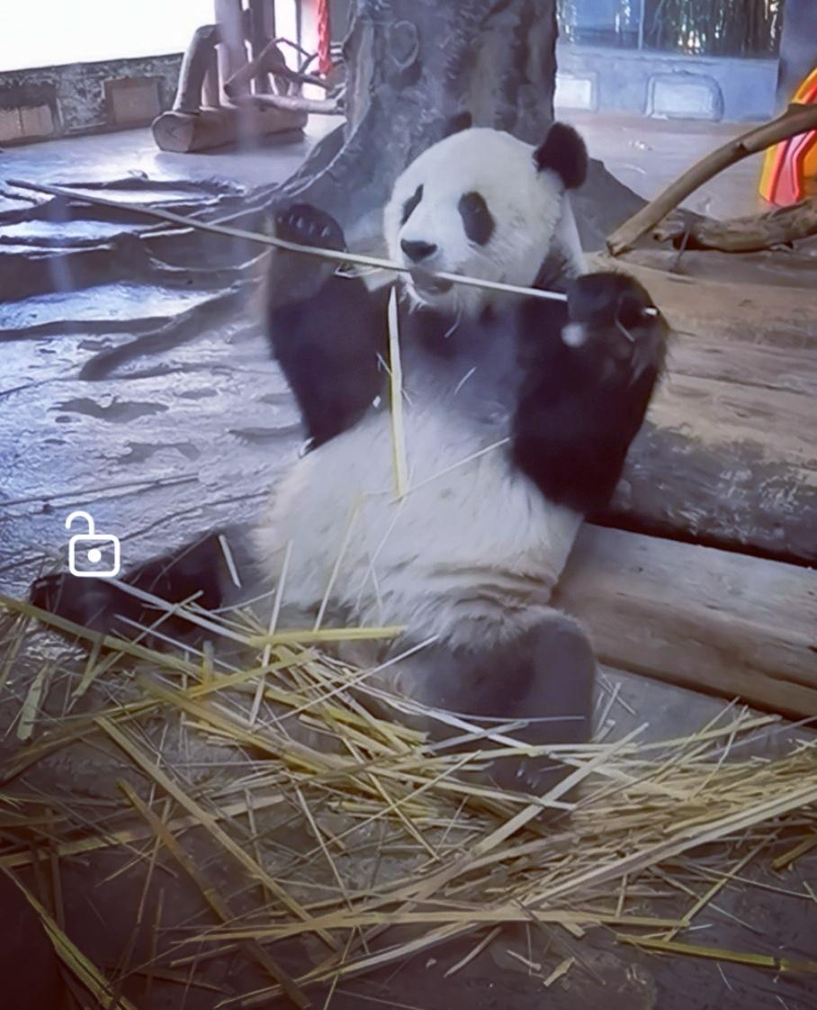 分享一张手机里的大熊猫照片在海南野生动植物园里,大熊猫“舜舜”正悠闲地抱着竹子,