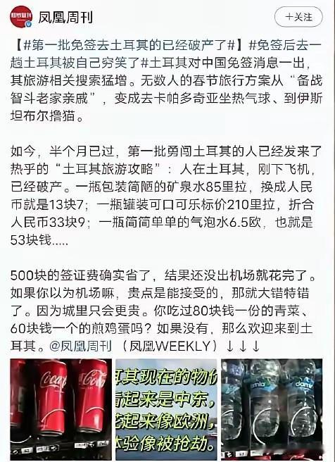 很多事情你看着是个大礼包,实际上它就是一个陷阱。 现在越来越多的国家对中国的游客免签了。 他们开放国门,欢迎中国的游客过去旅游。 但是您可真的要小心小心自己的钱包。 就比如说土耳其,2026年1月2号开始,土耳其官方决定,拥有中国普通护照的公民可以免签入境土耳其。 免签的时间还挺长,按照规定,中国公民拥有的免签时间为累计不超过90天。 这个时间真的挺适合深度游的。 但是您可别开心的太早,凤凰周刊报道称,第1批免签去土耳其的中产,已经破产了。 这里的破产当然不是真正的破产了,而是一种比喻句 实际上,他是在用夸张的标题来告诉大家,土耳其那边的物价究竟有多疯狂。 实话实说,除非您是富豪,否则普通人去那边真的就是活受罪 有的游客反映,人在土耳其刚下飞机就已经破产了。 一瓶非常普通,包装极其简陋,最便宜的矿泉水就要卖到85里拉。 折合成人民币就是13块7 一瓶易拉罐装的可口可乐,标价是210里拉,折合人民币33块9 一瓶简简单单的气泡水,折合人民币53块。 很多网友纷纷哭笑不得的说道,土耳其政府确实是给大家免了500块钱的签证费 结果免得这点钱还没出机场,就已经全花完了 可是人都来了,你也不能原路返回啊,等到你进城之后,更高的物价,像一个一个刺客一样,正在等着你。 80块钱人民币一份的炒青菜,60块人民币一份的炒鸡蛋。 在那边人均吃一顿简餐的价钱,基本上都在400块人民币左右。 这个时候一定有很多大聪明会说,你去的都是那些坑游客的小店,你去国际化的连锁大超市啊。 你看看,你看看,你又拿着国内的经验生搬硬套了。 咱们看看土耳其麦当劳的普通物价吧。 汉堡,可乐,薯条,最经典的三件套,随便一套,折合人民币就要210块 比外面小店确实便宜一点,但是这个价格也够肉疼了。 至于说你非得要维持国内小资生活的派头,天天喝点咖啡什么的,星巴克两小杯咖啡,也需要200多块。 以上的价格全部都是折合成人民币之后的价钱。 实际上土耳其这次对中国游客开放免签,目的就是来薅羊毛的 土耳其国内它的物价有两套体系,一套是针对游客的,一套则是针对本地老百姓 由于土耳其对本地民众有一种面包补贴。 他们可以用极其低廉的价格购买到主食,所以普通民众的温饱问题还是可以解决的。 但是这种小店一般不对游客开放,你需要凭证购买。 因为这是土耳其政府给本国国民的一种超级福利 而那些本地人经常吃的一些小餐馆,也会有两套菜单。 一套是本国人民的,另外一套则是给外国游客的 所以你去了,就一定要做好准备被薅羊毛。 其实普通土耳其人,他们生活的条件也是很艰苦的,您不要以为他们自己的菜单就很便宜。 曾经有博主分享过,他们走到老城区最普通的居民区里面。 找到了一家当地民众喜欢吃的土耳其烤肉店 通过翻译软件,再三确定了价钱之后,两个人还花了188块钱人民币。 而这个价钱基本上和当地普通民众的消费水平是画等号 因为土耳其最近这几年通货膨胀非常的严重。 普通的民众也是不敢天天吃烤肉的,很多时候都是买一些政府补贴的廉价面包,家里再做一些肉酱或者浓汤,也就解决问题了。 这仅仅是吃饭问题,如果把门票、住宿,还有出行的问题都算上,那么土耳其简直就是一个销金窟啊。 那些全球知名的景点,基本上每个月涨一次价钱。 黑车司机横行,基本上都是看人下菜碟。 尤其是咱们这些中国人,在全球早就是公认的软柿子了。 所以说宰起来,他们是一点心理负担都没有啊。 按照土耳其政府的计划是5年里要吸引1,000万中国游客。 可是2024年他们才吸引到41万的中国游客 回血实在是太慢了,所以才有了这次的免签政策。 其实土耳其的经济真的是挺魔幻的,有媒体曾经采访过土耳其的资深从业者。 他们也很无奈,他们表示,2019年前后,在土耳其,一顿饭花20多块钱,你可以吃到撑。 可是到现在,你花200多块钱还未必能吃饱 整个国家通货膨胀严重,二四年的时候通胀甚至冲到了85% 土耳其的里拉暴跌啊,老百姓真实的工资,实际上才折合2000多人民币 土耳其政府已经从本国民众身上薅不到任何羊毛了 所以他们只能从外国游客身上下手 过去他们的目标主要是欧洲游客,但是欧洲游客这些年来手里面也已经素了。 想来想去,还是中国游客的市场庞大,毕竟人口基数在这摆着呢。 这才有了今年2月份的大规模免签政。 所以说大家不要相信天上凭空掉下来的大礼包,有可能你才是那个大礼包 节目最后,心净再给大家分享一个消息。 1月15号,柬埔寨政府旅游部发布了最新的通告。 公告显示,从2026年6月份开始,中国公民无需提前申请签证 也不用支付任何的签证费用,你只需要在网络上填一张电子入境卡,就可以入境柬埔寨。 这次免签政策最多可以停留14天 好了大家看看吧又送你一个大礼包,你敢接吗? 更有意思的是,1月17号,咱们国家驻柬埔寨大使馆对外发文。 敦促检方加大对中国公民的保护力度。 您品,仔细的品