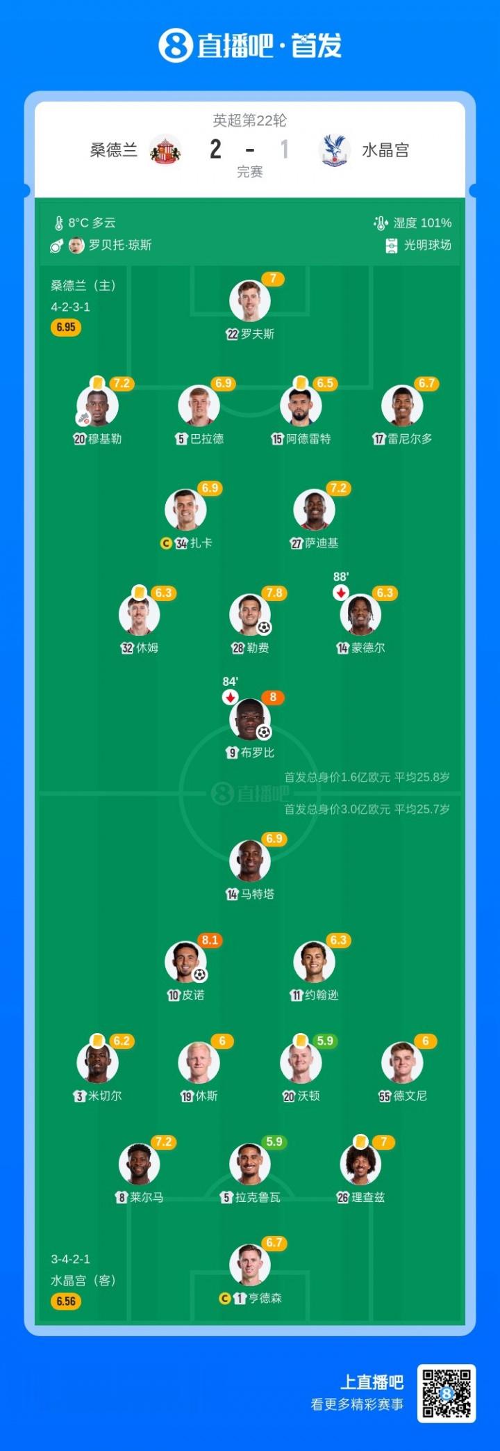 水晶宫不敌桑德兰遭遇10场不胜,格拉斯纳全场0换人、格伊缺战