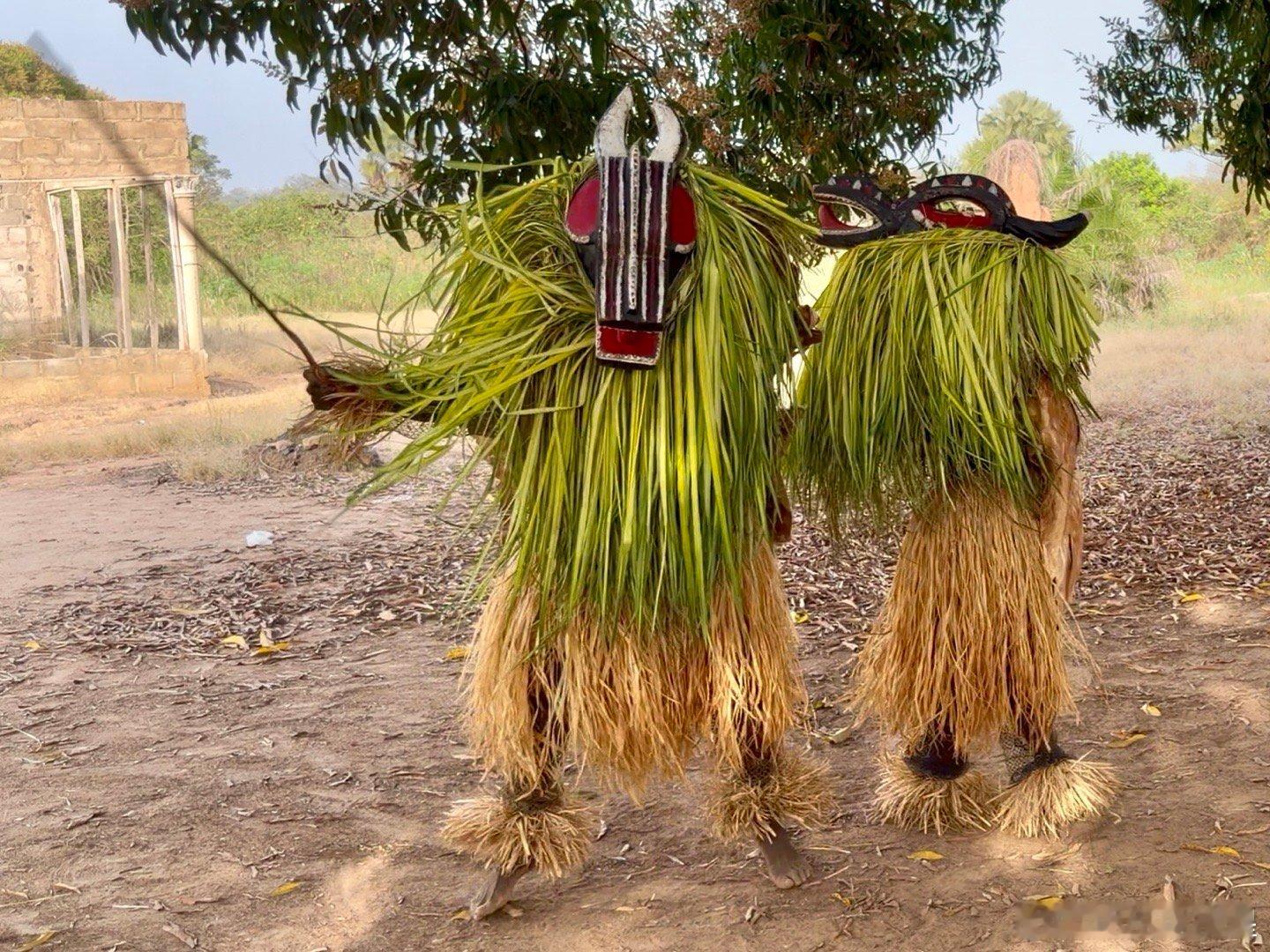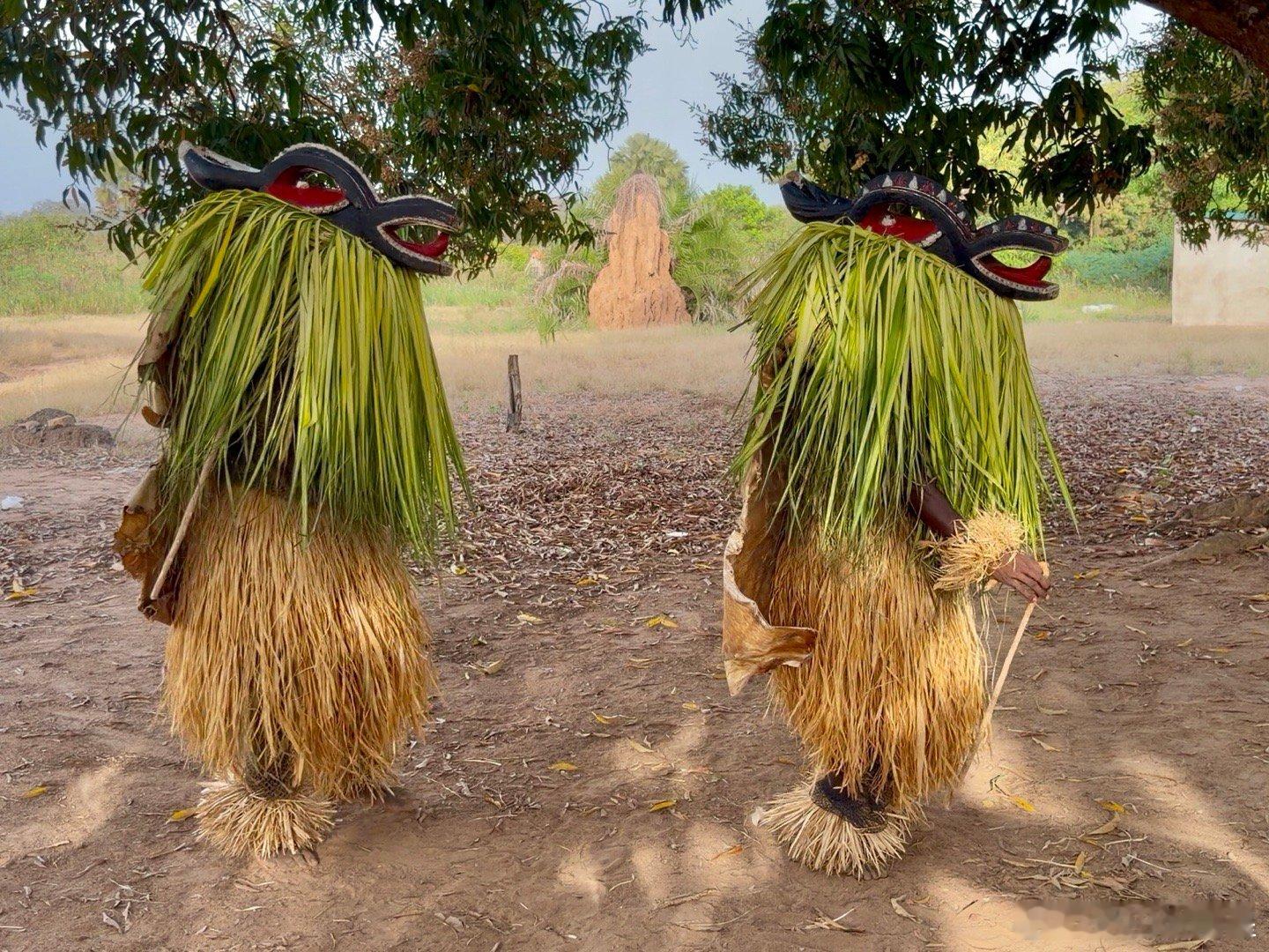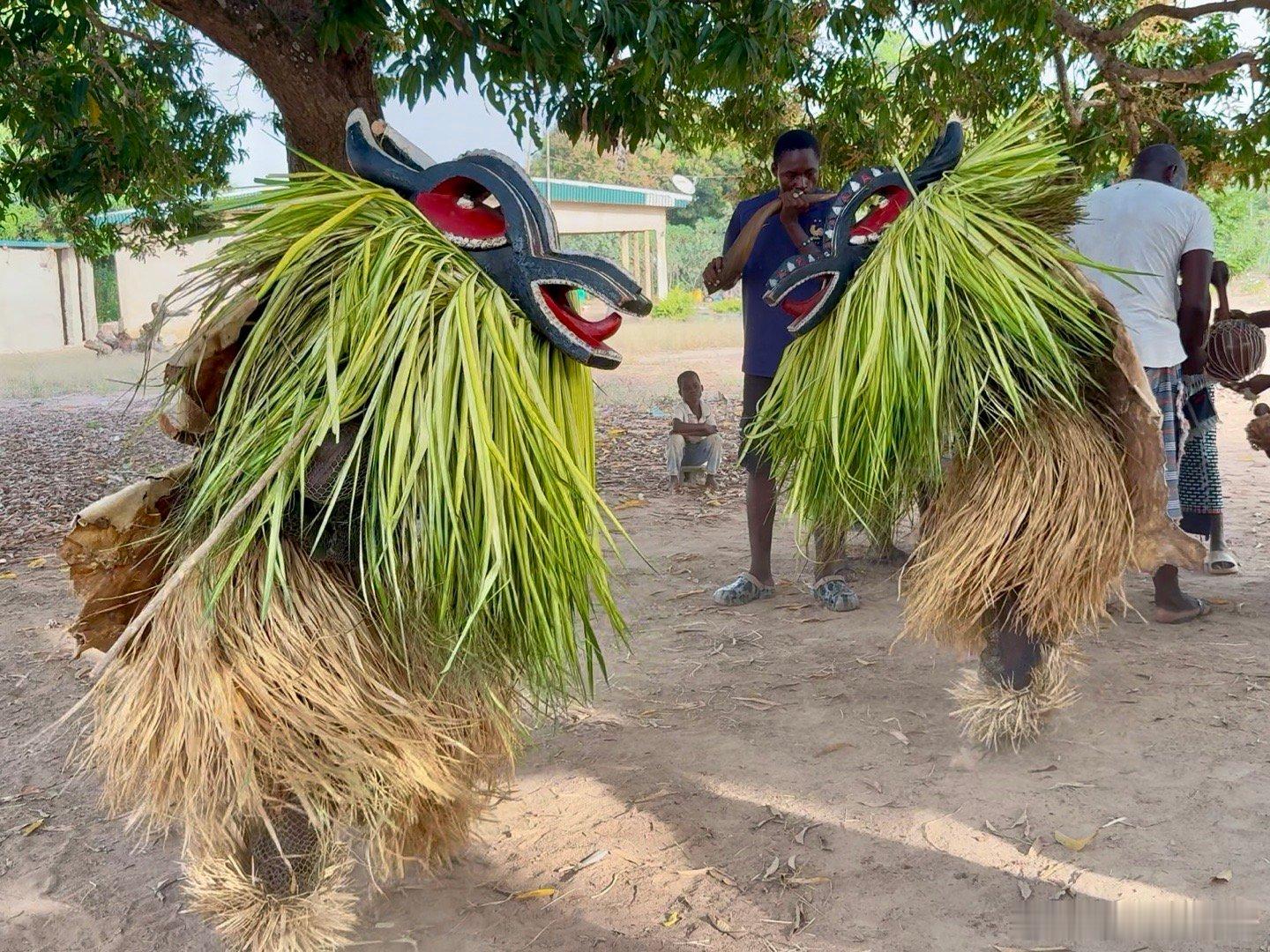 西非戈利舞。今天来到科特迪瓦中部的孔德亚克罗村(Konde Yaokro),这里属于Baoulé(Baule)族的主要聚居区。戈利舞是Baoulé族的传统面具舞,起源于邻近的Wan族,大约在1900-1910年间传入Baoulé,现在是娱乐、丰收、贵宾来访或重要人物葬礼的头牌表演。一场Goli全村参与,可以从早跳到晚,伴随鼓乐、歌唱、棕榈酒,充满欢乐与仪式感。面具舞者成对出现,完整的表演有四对面具固定顺序出现,逐步升级:1. Kple Kple(圆盘脸,初级/青年),2. Goli glen(动物头盔,父亲/祖先力量),3. Kpan pre(带角的脸),4. Kpan(人脸带发冠,最高级)。今天只看了1级和2级。1级红色面具Kple Kple象征年轻、弱小、活力与太阳的生命力。舞蹈快速跺脚、交替表演,像青少年在玩闹热身。动作节奏快、活泼,目的是吸引观众、准备迎接更强的面具。2级Goli glen是大型头盔式面具,结合了野牛、瞪羚和鳄鱼元素,脸部涂黑白红条纹,充满动态感。舞者身上覆盖新鲜绿色草纤维,表现“野兽从森林降临”。这是从“青年”向“强大”的过渡表演,体现祖先以野兽形态从森林进入村庄,它们比Kple Kple更具威慑力,提醒人们森林和祖先的权威。这场舞蹈有高速跺脚,鞭子猛抽背部兽皮发出响声,节奏快而有力。女性和小孩必须和舞者保持距离,因为它代表神秘的“野性力量”,不可被弱小力量碰触。谢田的环球足迹