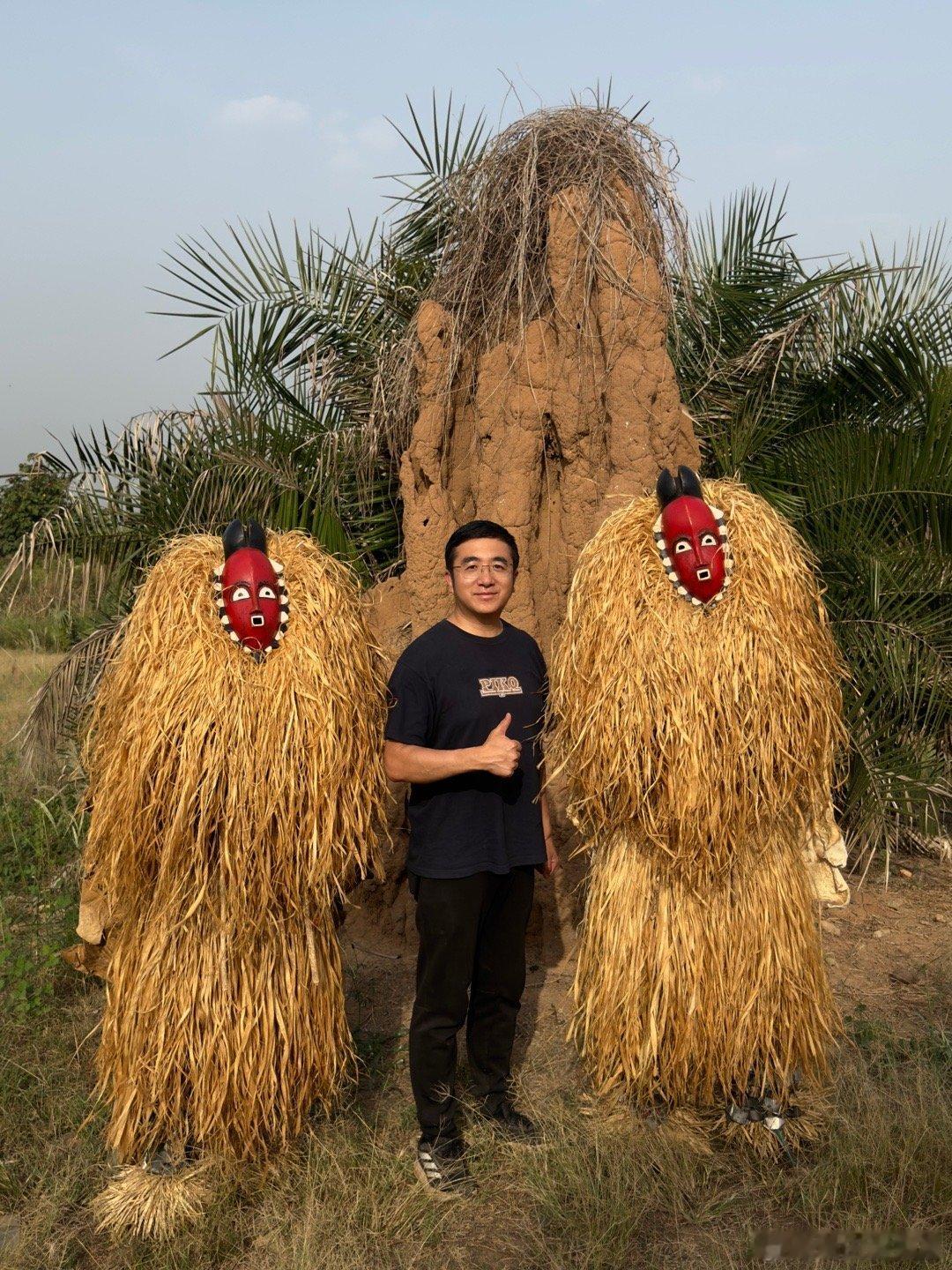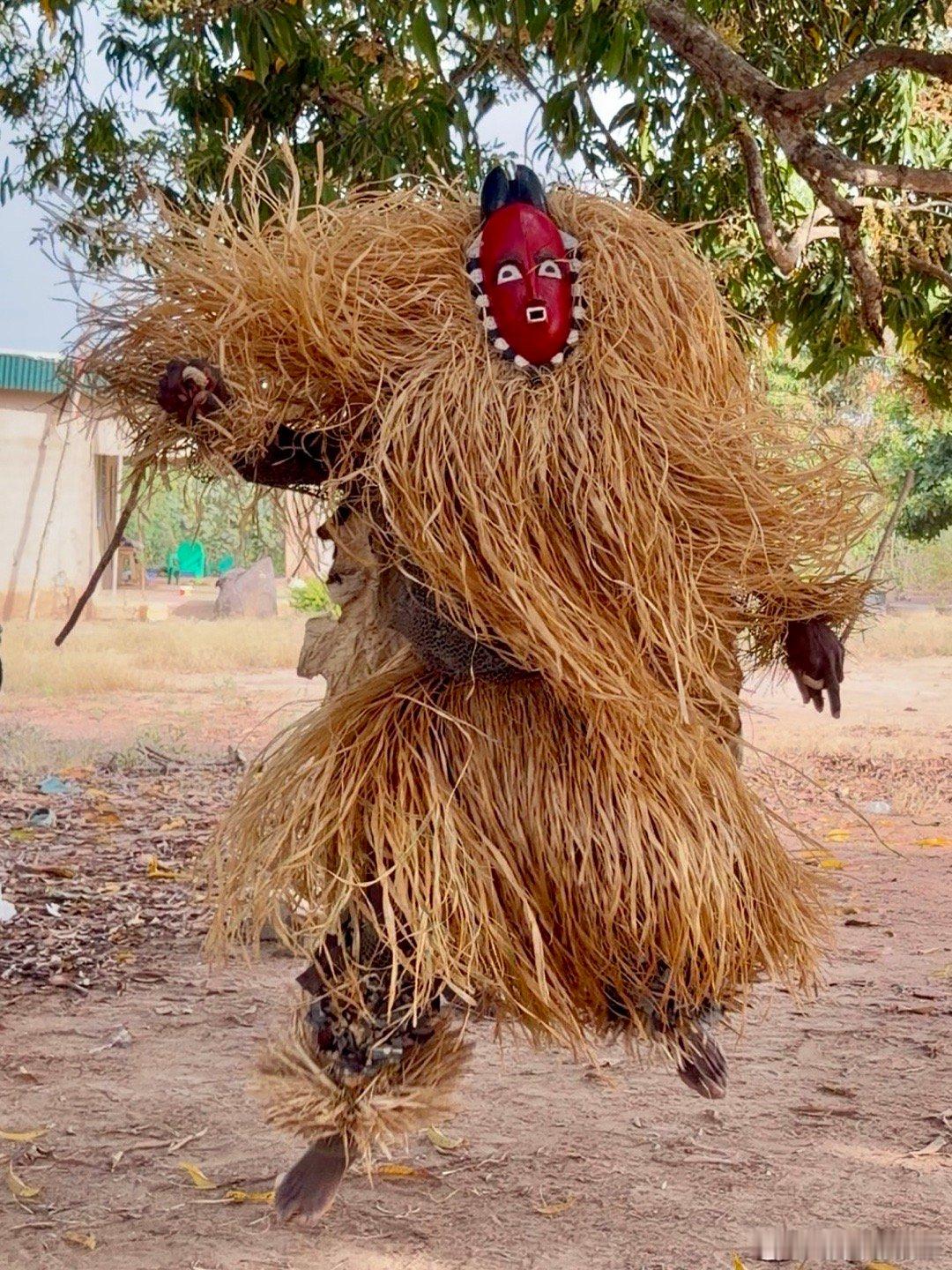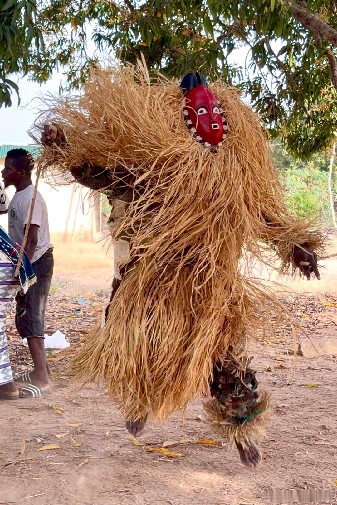 西非戈利舞。今天来到科特迪瓦中部的孔德亚克罗村(Konde Yaokro),这里属于Baoulé(Baule)族的主要聚居区。戈利舞是Baoulé族的传统面具舞,起源于邻近的Wan族,大约在1900-1910年间传入Baoulé,现在是娱乐、丰收、贵宾来访或重要人物葬礼的头牌表演。一场Goli全村参与,可以从早跳到晚,伴随鼓乐、歌唱、棕榈酒,充满欢乐与仪式感。面具舞者成对出现,完整的表演有四对面具固定顺序出现,逐步升级:1. Kple Kple(圆盘脸,初级/青年),2. Goli glen(动物头盔,父亲/祖先力量),3. Kpan pre(带角的脸),4. Kpan(人脸带发冠,最高级)。今天只看了1级和2级。1级红色面具Kple Kple象征年轻、弱小、活力与太阳的生命力。舞蹈快速跺脚、交替表演,像青少年在玩闹热身。动作节奏快、活泼,目的是吸引观众、准备迎接更强的面具。2级Goli glen是大型头盔式面具,结合了野牛、瞪羚和鳄鱼元素,脸部涂黑白红条纹,充满动态感。舞者身上覆盖新鲜绿色草纤维,表现“野兽从森林降临”。这是从“青年”向“强大”的过渡表演,体现祖先以野兽形态从森林进入村庄,它们比Kple Kple更具威慑力,提醒人们森林和祖先的权威。这场舞蹈有高速跺脚,鞭子猛抽背部兽皮发出响声,节奏快而有力。女性和小孩必须和舞者保持距离,因为它代表神秘的“野性力量”,不可被弱小力量碰触。谢田的环球足迹