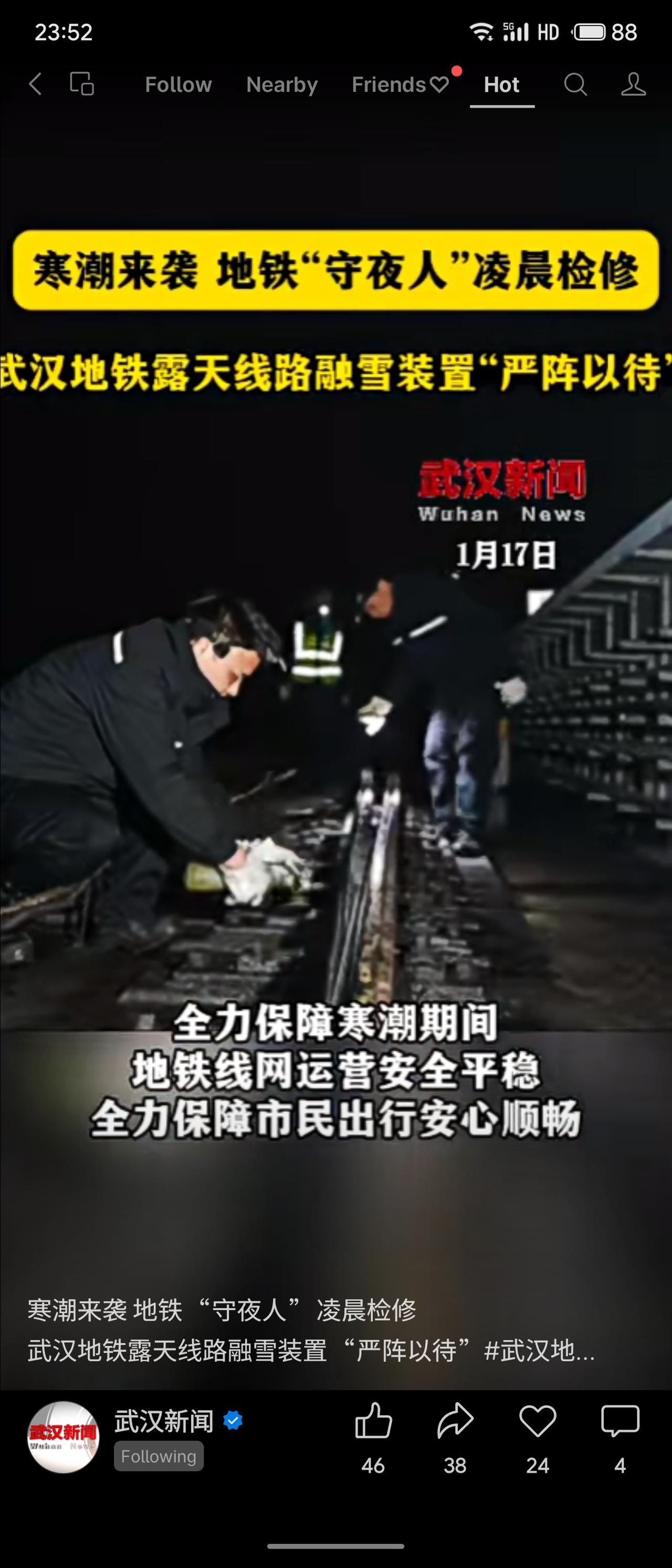为应对今冬最强寒潮,武汉地铁提前部署,组织“守夜人”在凌晨进行设备检修和隐患排查,确保露天线路融雪装置就位,全力保障寒潮期间地铁运营安全与市民出行顺畅。