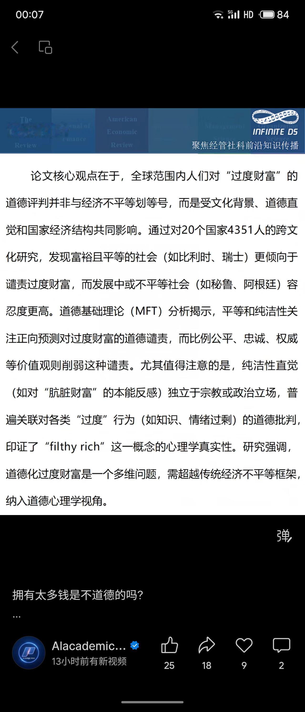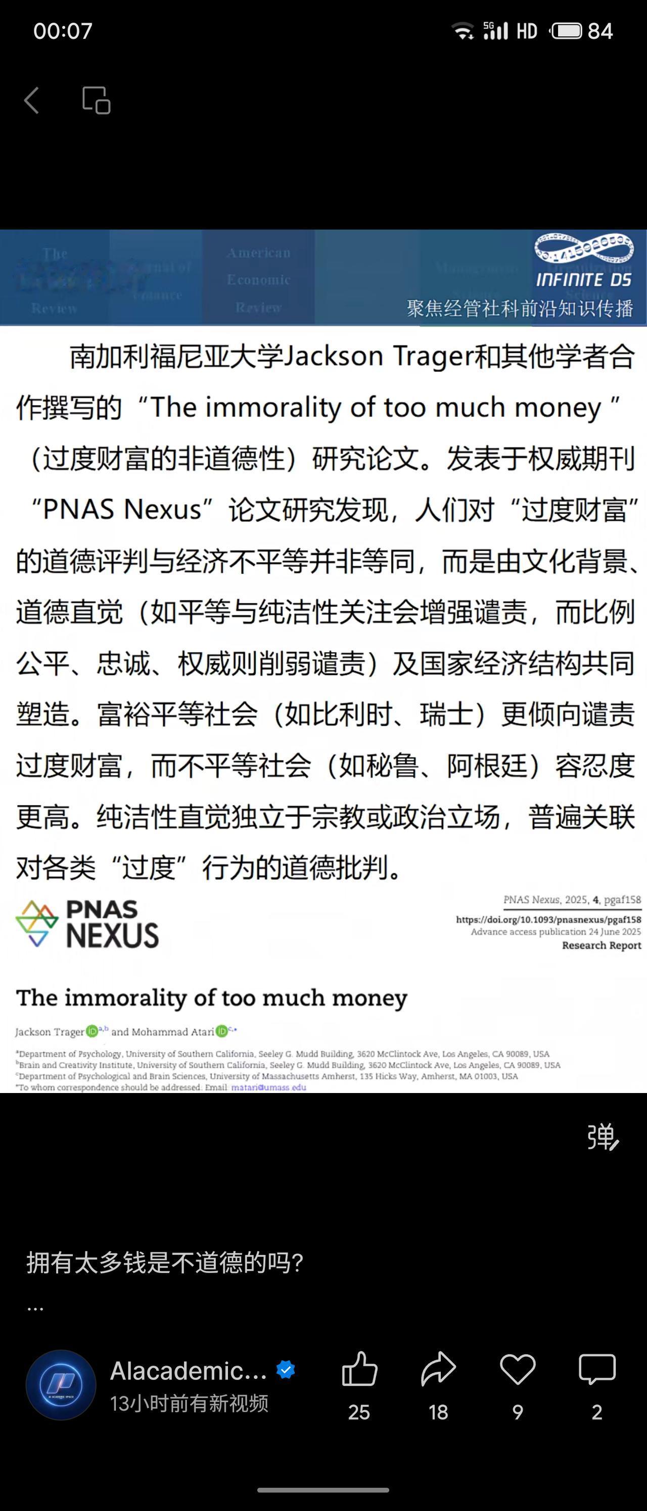 《过度财富的非道德性》研究发现,对“过多财富”的道德评判并非由经济不平等直接决定,而是受文化、道德直觉与国家经济结构影响。富裕平等社会更倾向谴责,不平等社会容忍度高。纯洁性直觉普遍增强批判,比例公平等则削弱。