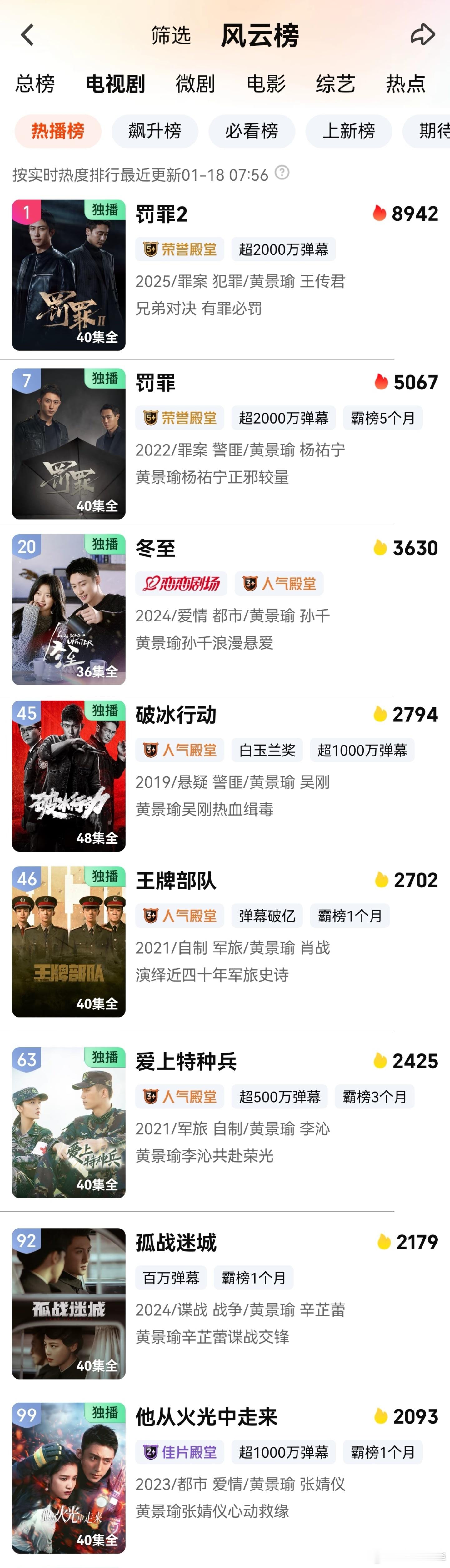 罚罪2收官罚罪2 破纪录!!爱奇艺热播榜有8个黄景瑜的剧!!1、罚罪2(已完结可放心观看),7、罚罪,20、冬至(江苏卫视冬至 正在热播),45、破冰行动,46、王牌部队,63、爱上特种兵,92、孤战迷城,99、他从火光中走来。你要说爱奇艺黄景瑜底盘高,他2024年播的《雪迷宫》在优酷热播榜16(广东卫视正在热播中),腾讯《赢风》正在跑步前进。全世界喜欢演技好的美男子的观众就是他的底盘。