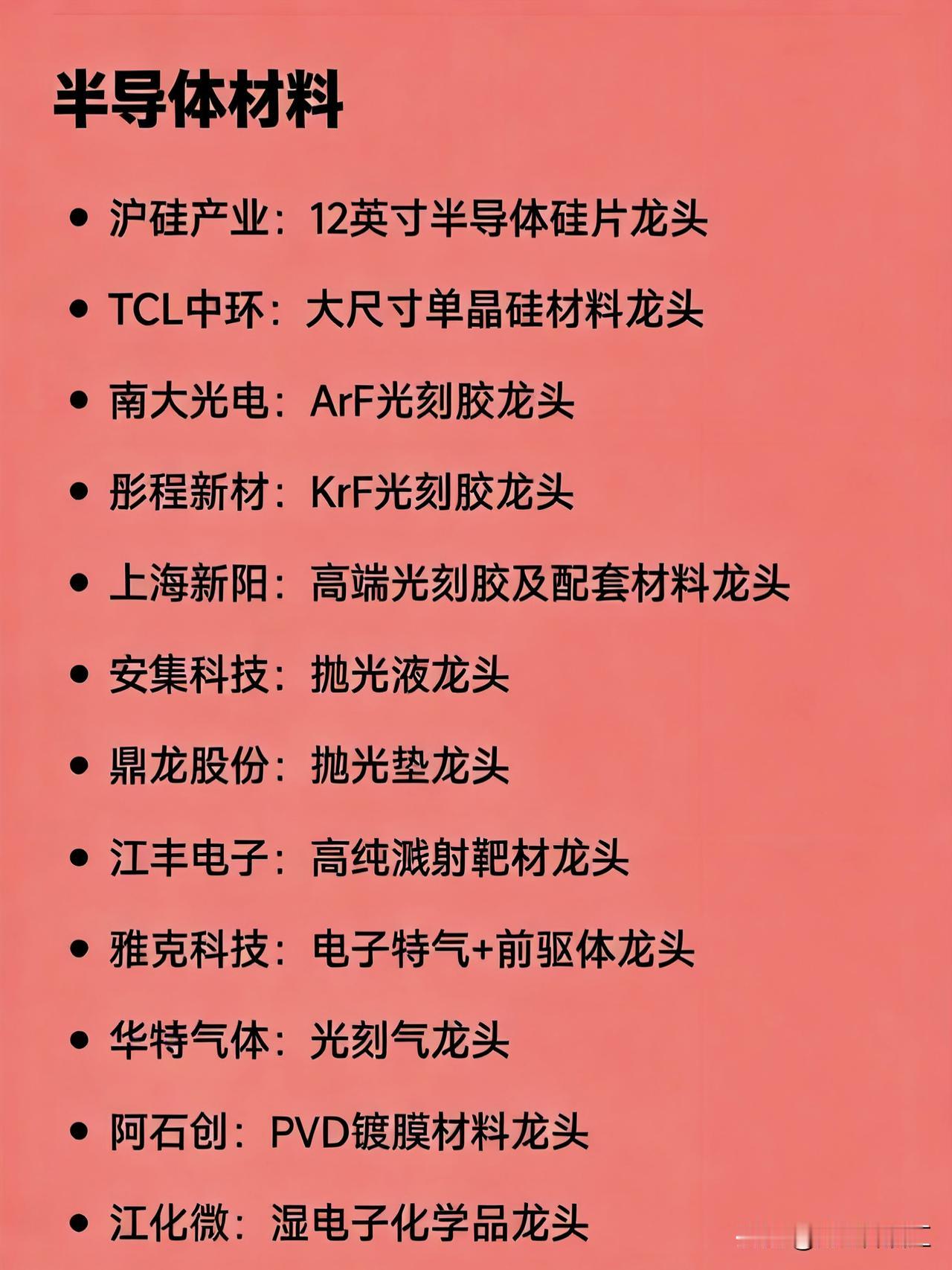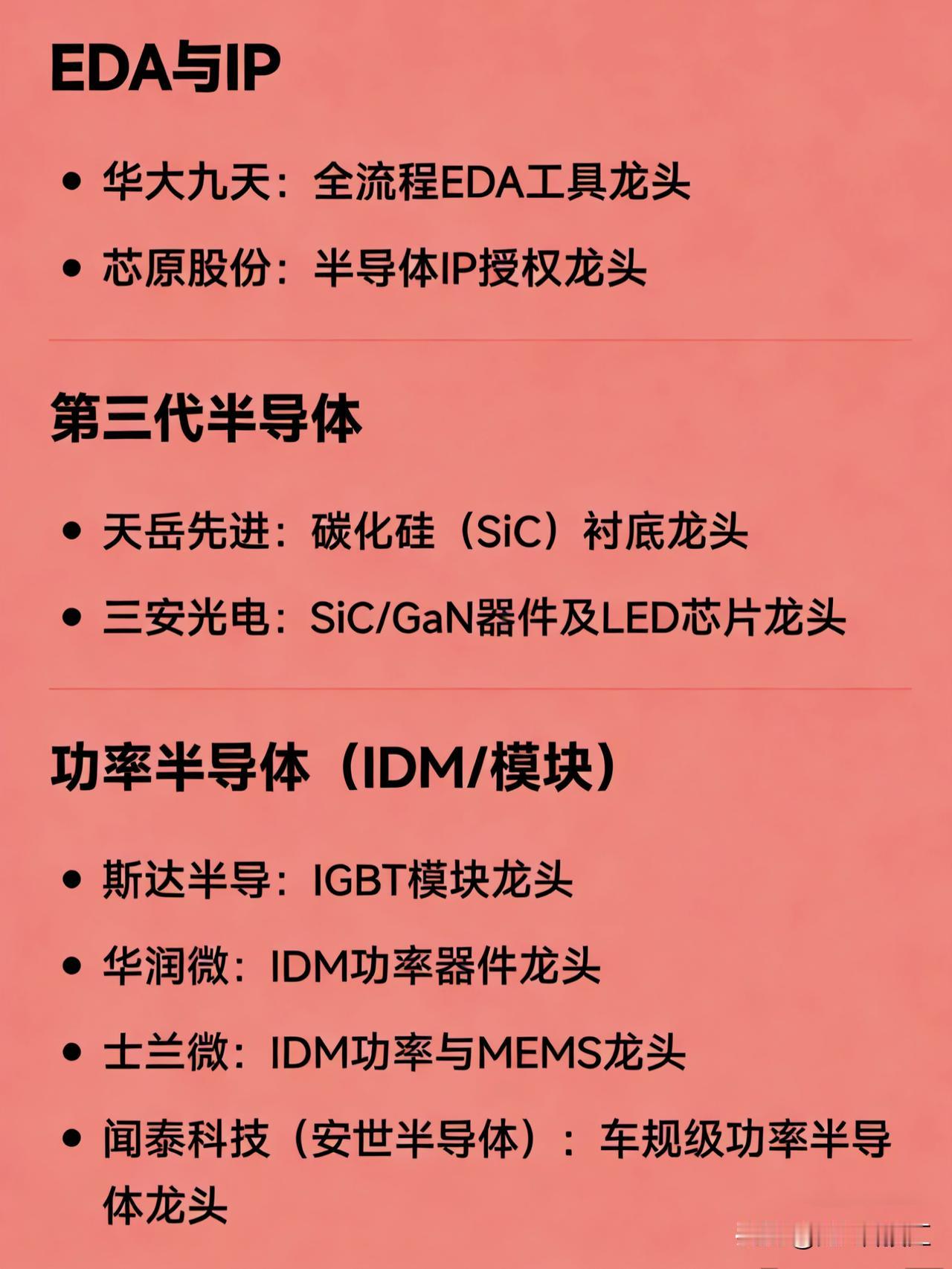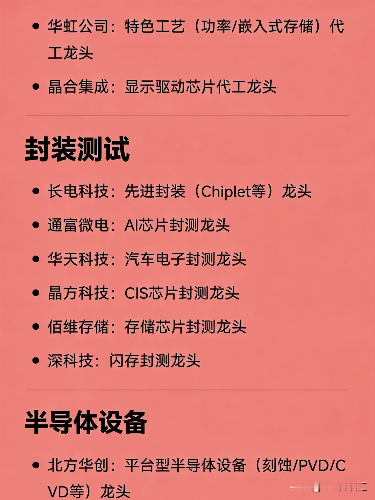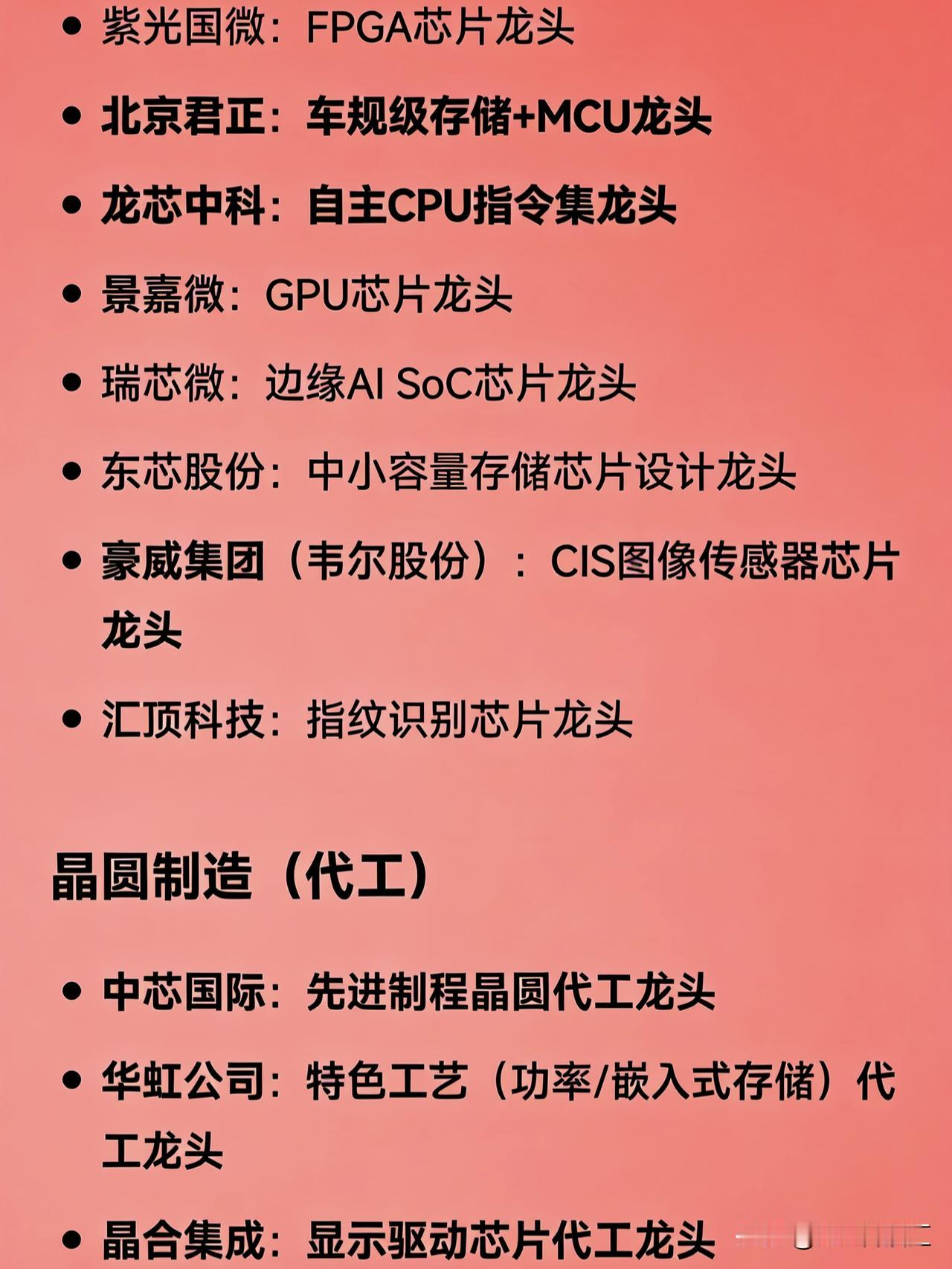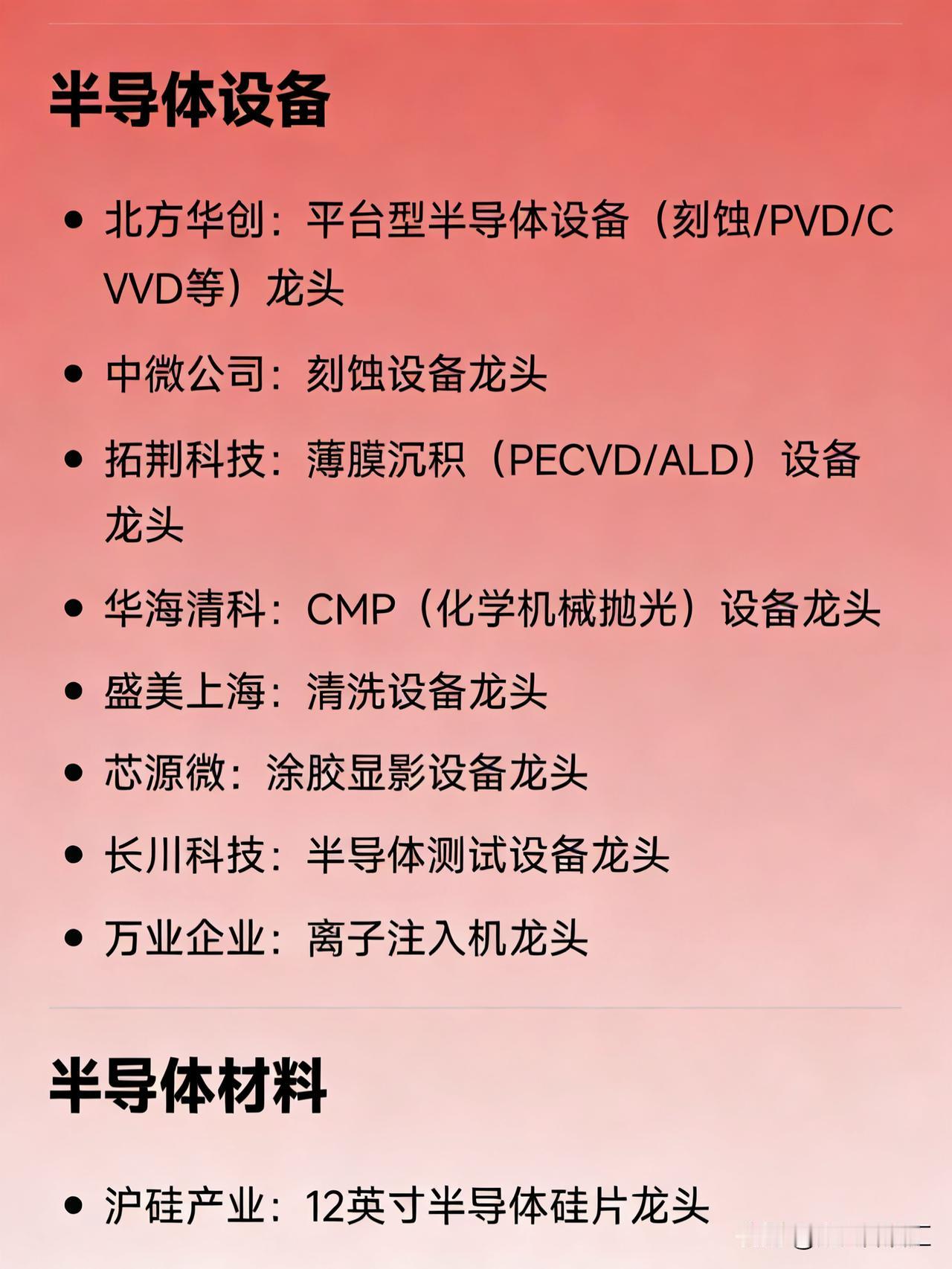 2026国产半导体产业链各细分领域的龙头代表 芯片设计 海光信息:国产CPU/DCU(AI加速芯片)龙头 寒武纪:AI芯片龙头 兆易创新:NOR Flash存储芯片龙头 澜起科技:内存接口芯片龙头 卓胜微:射频前端芯片龙头 圣邦股份:模拟芯片龙头 紫光国微:FPGA芯片龙头 北京君正:车规级存储+MCU龙头 龙芯中科:自主CPU指令集龙头 景嘉微:GPU芯片龙头 瑞芯微:边缘AI SoC芯片龙头 东芯股份:中小容量存储芯片设计龙头 豪威集团(韦尔股份):CIS图像传感器芯片龙头 汇顶科技:指纹识别芯片龙头   晶圆制造(代工) 中芯国际:先进制程晶圆代工龙头 华虹公司:特色工艺(功率/嵌入式存储)代工龙头 晶合集成:显示驱动芯片代工龙头   封装测试 长电科技:先进封装(Chiplet等)龙头 通富微电:AI芯片封测龙头 华天科技:汽车电子封测龙头 晶方科技:CIS芯片封测龙头 佰维存储:存储芯片封测龙头 深科技:闪存封测龙头   半导体设备 北方华创:平台型半导体设备(刻蚀/PVD/CVD等)龙头 中微公司:刻蚀设备龙头 拓荆科技:薄膜沉积(PECVD/ALD)设备龙头 华海清科:CMP(化学机械抛光)设备龙头 盛美上海:清洗设备龙头 芯源微:涂胶显影设备龙头 长川科技:半导体测试设备龙头 万业企业:离子注入机龙头   半导体材料 沪硅产业:12英寸半导体硅片龙头 TCL中环:大尺寸单晶硅材料龙头 南大光电:ArF光刻胶龙头 彤程新材:KrF光刻胶龙头 上海新阳:高端光刻胶及配套材料龙头 安集科技:抛光液龙头 鼎龙股份:抛光垫龙头 江丰电子:高纯溅射靶材龙头 雅克科技:电子特气+前驱体龙头 华特气体:光刻气龙头 阿石创:PVD镀膜材料龙头 江化微:湿电子化学品龙头   EDA与IP 华大九天:全流程EDA工具龙头 芯原股份:半导体IP授权龙头   第三代半导体 天岳先进:碳化硅(SiC)衬底龙头 三安光电:SiC/GaN器件及LED芯片龙头   功率半导体(IDM/模块) 斯达半导:IGBT模块龙头 华润微:IDM功率器件龙头 士兰微:IDM功率与MEMS龙头 闻泰科技(安世半导体):车规级功率半导体龙头