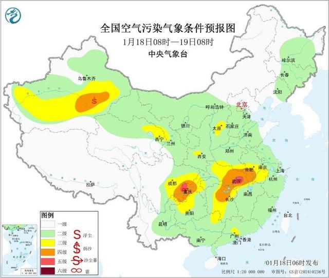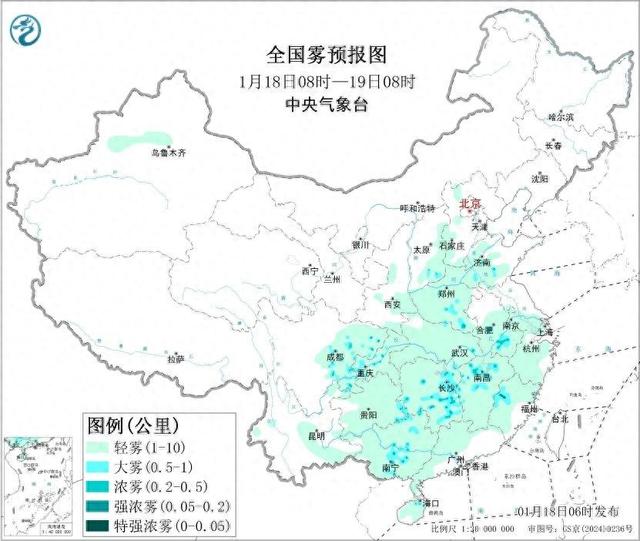 18日白天,四川盆地、江汉、江南中西部等地有轻到中度霾,局地有重度霾。18日早晨至上午,四川东部和南部、江南中西部、华南西部等地有大雾,局地有能见度不足200米的强浓雾。19日,受冷空气和降水影响,上述地区的雾霾天气逐渐减弱或消散。此外,18日,受冷空气大风影响,新疆南部和东部等地有沙尘天气。