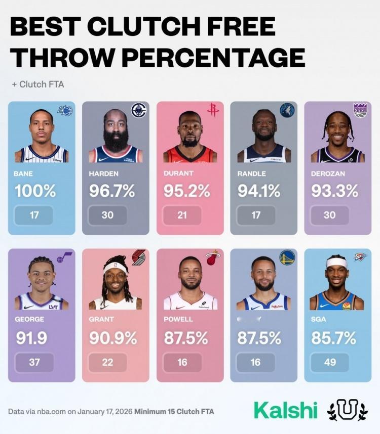 关键时刻罚球命中率:贝恩100%第1 哈登第2杜兰特第3 库里才第9库里本赛季迄今罚球命中率93.1%联盟第二,仅次于小卡的94.1%,这命中率在库里17年职业生涯里也已经能排进前三了库里金州勇士库里