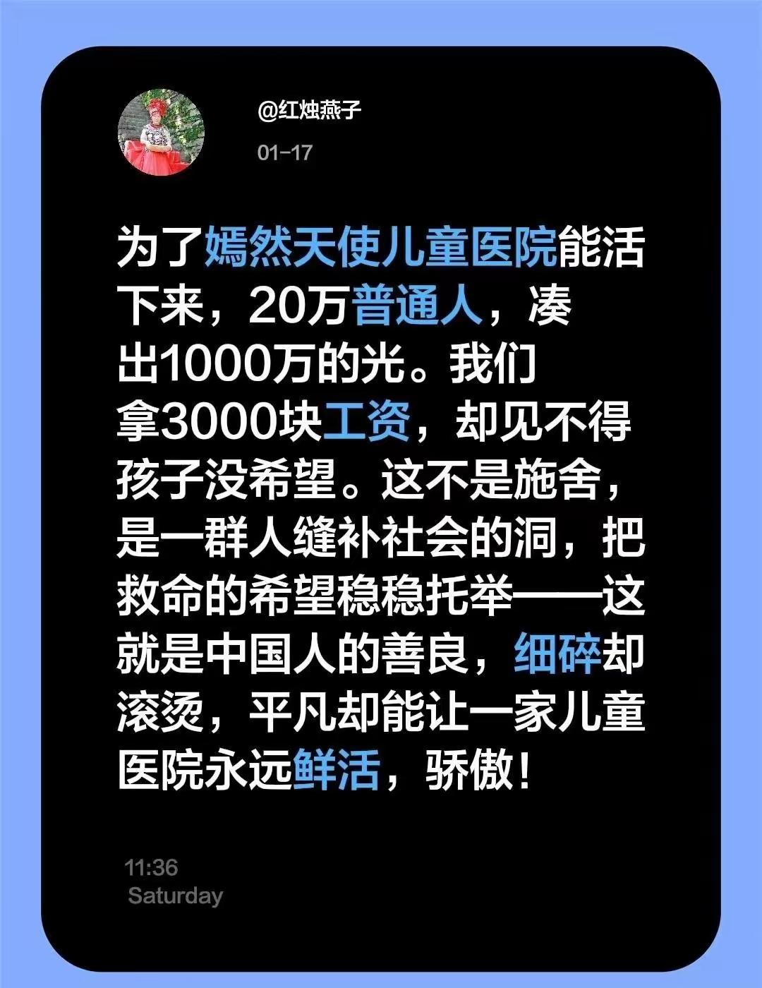 这几天给嫣然儿童医院捐款登顶热搜榜第一,剧中的“令狐冲”,现实中的“李亚鹏”,经过这个事情才让我们真正认识了这个“真男人”,“侠之大者”才是这样诠释的 。早些年投资失败,被称为“商业黑洞”殊不知在这些词的后面却默默的从事公益几十年,商业失败被众嘲,没有借助妻女的流量卖惨叫穷,即便是债务缠身还是一个人独受,却坚持公益几十年,其中的心酸,也许只有他自己才知道,和前段时间的“酸黄瓜”事情形成鲜明的对比。 如今事件已经过去好几天了,明星们,明星企业家们却没有一个人发声,还得靠我们这些普罗大众分分解囊,两天的时间捐款超千万 ,一百,五十,一千,二十,靠的是“众人拾柴火焰高”的万众一心,高收入的明星群体汗颜不?明星企业你们羞愧不?所以那些追星族追捧你们干什么?真正发生事情了你们在哪里?你们龟缩的连声都不敢发,你们的收入哪怕是一点点都能给与这些孩子不一样的人生,最后还得是我们这些“酸黄瓜”扛下了所有,我们这些普罗大众几千块一个月的普通人扛起了这个责任。 我们不是仇富而是仇没有良心的人。