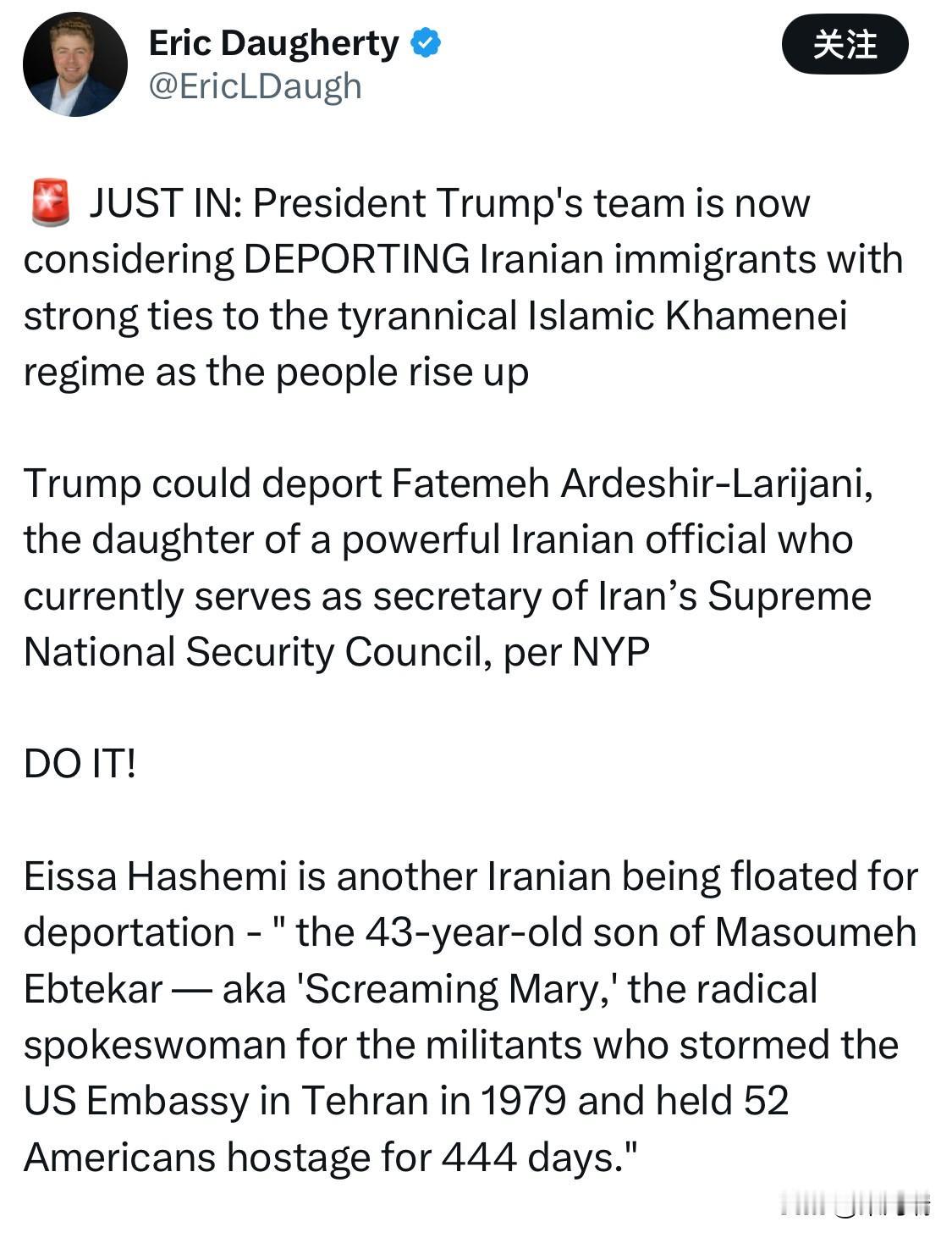 最新消息:随着伊朗民众奋起反抗,特朗普总统的团队正在考虑驱逐与专制的伊斯兰哈梅内伊政权关系密切的伊朗移民。 据《纽约邮报》报道,特朗普可能将法蒂玛·阿尔德希尔-拉里贾尼驱逐出境。法蒂玛是伊朗一位权势人物的女儿,目前担任伊朗最高国家安全委员会秘书。 埃萨·哈希米是另一位面临驱逐出境的伊朗人——“他是马苏梅·埃布特卡尔(又名‘尖叫的玛丽’)的43岁儿子,马苏梅·埃布特卡尔是1979年袭击美国驻德黑兰大使馆并将52名美国人扣为人质444天的激进分子的发言人。” 法蒂玛·阿尔德希尔-拉里贾尼(Fatemeh Ardeshir-Larijani,又名 Fatima Ardeshir-Larijani)是伊朗资深政客、现任国家最高安全委员会秘书阿里·拉里贾尼(Ali Larijani)的女儿。 据报道,她目前居住在美国。2026年1月的消息显示,她身处佐治亚州,身份是一名医学教授或医生。 由于其父亲在伊朗政府中的高层地位,她与多位居住在美国的伊朗高官亲属近期受到了舆论关注。 2026年1月,部分在美伊朗裔活动人士发起请愿,呼吁美国当局驱逐居住在美境内的伊朗高官亲属,她被列为针对目标之一。与此同时,美国政府于2026年1月15日对她的父亲阿里·拉里贾尼实施了新的制裁。