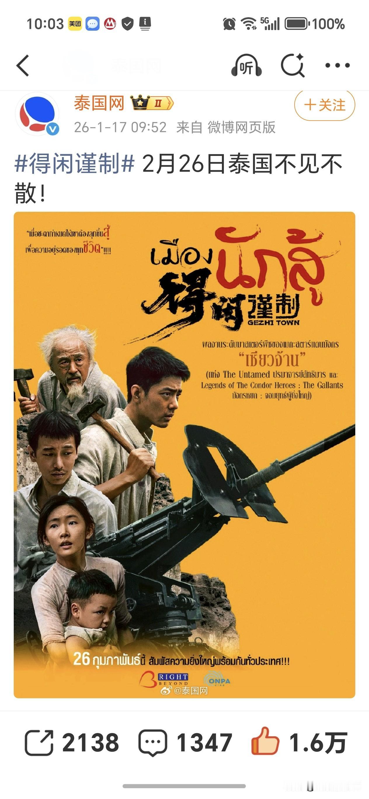 肖战《得闲谨制》2月26日泰国隆重上映,肖战的电影都是100%出海的,这才是世界巨星带来的影响力,有效文化输出[赞][赞][加油]