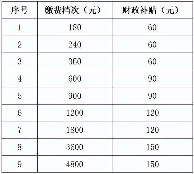 中山市城乡居民基本养老保险个人缴费标准设为每人每年180元、240元、360元、600元、900元、1200元、1800元、3600元、4800元九个档次。政府按照缴费档次,对应给予补贴。