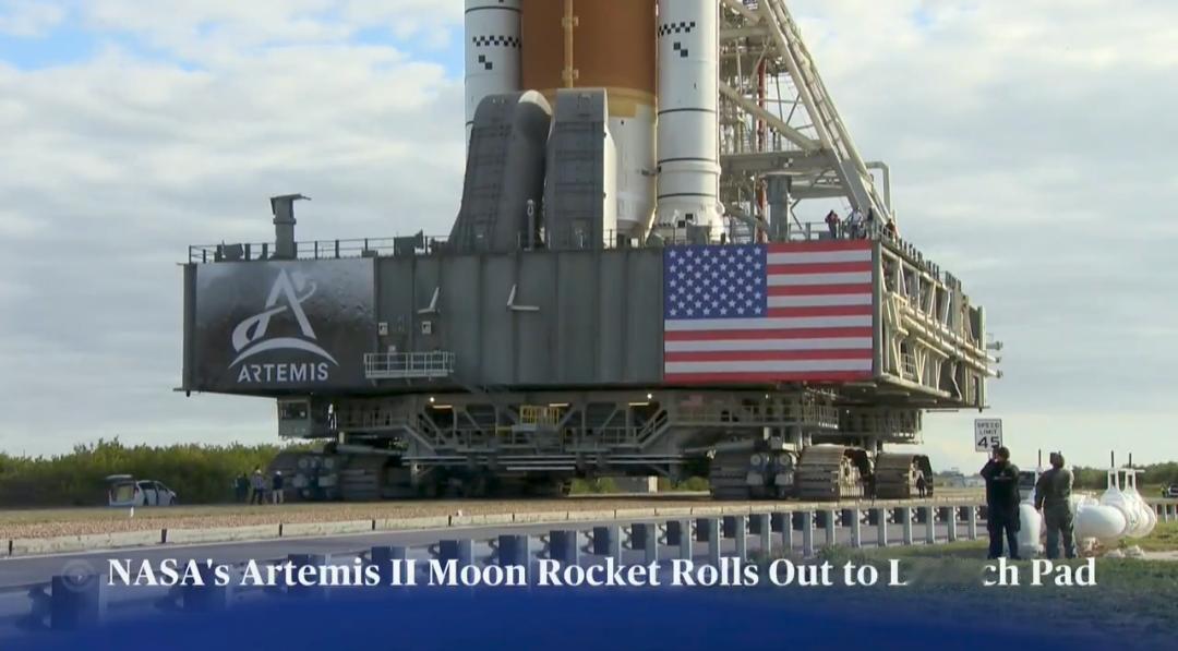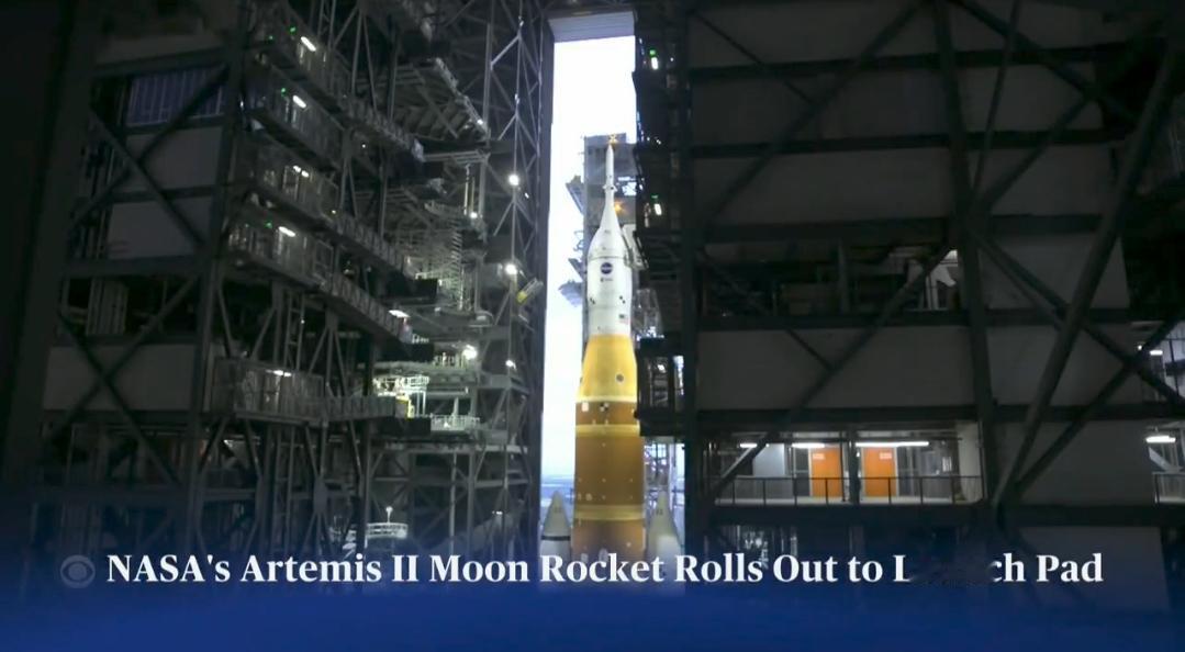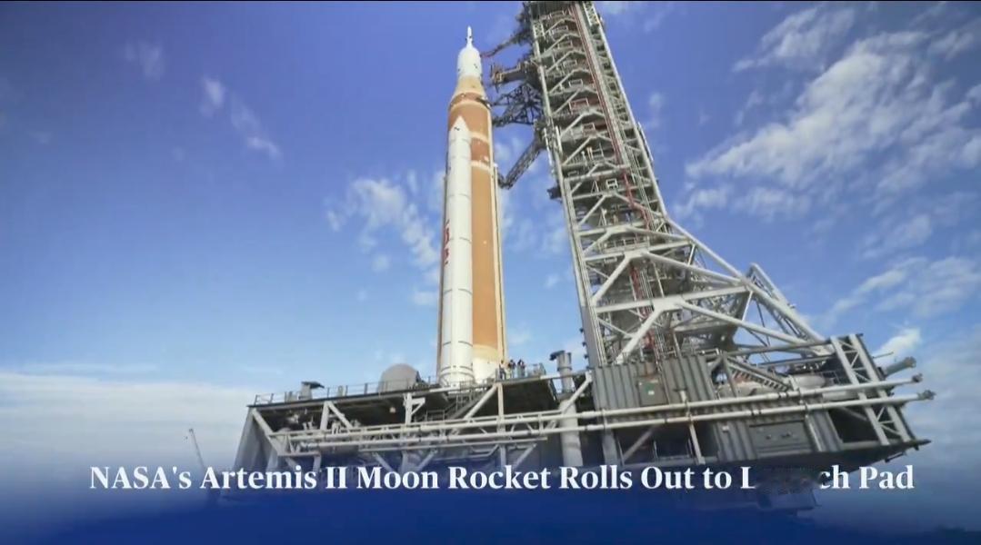 新闻快讯——NASA巨型登月火箭转运至发射台 下月将送4名宇航员绕月飞行 经过数月精心准备,美国航天局(NASA)32层楼高的太空发射系统(SLS)火箭——目前全球现役最强大助推器——于周六被转运至佛罗里达州海滨发射台,为万众期待的下月绕月飞行任务铺路,届时将搭载4名宇航员执行环月之旅。消息来源CBS,AP