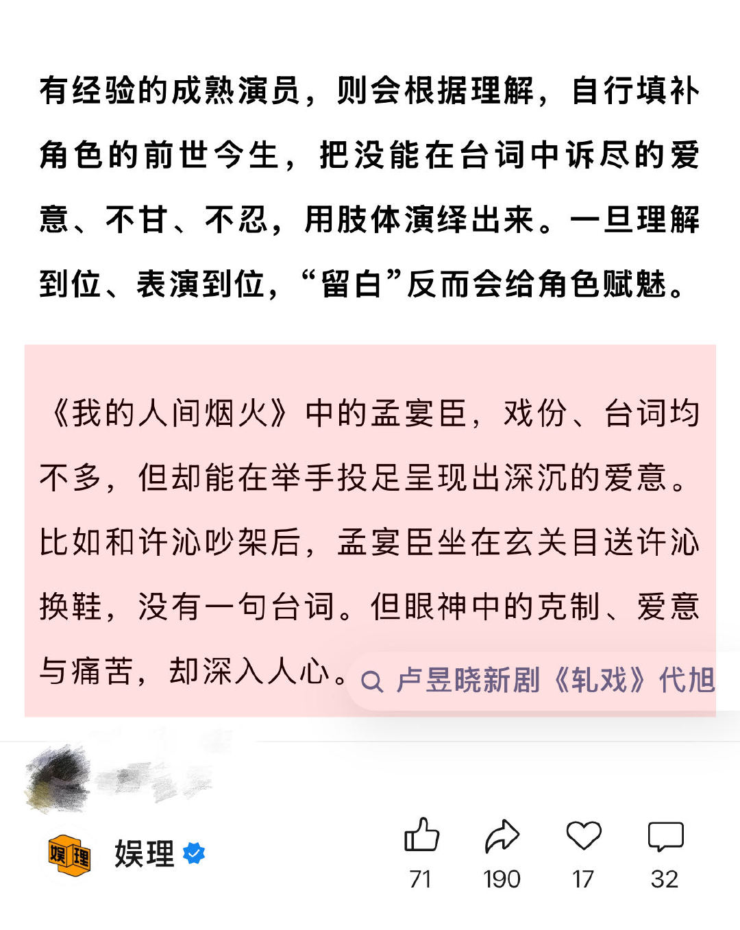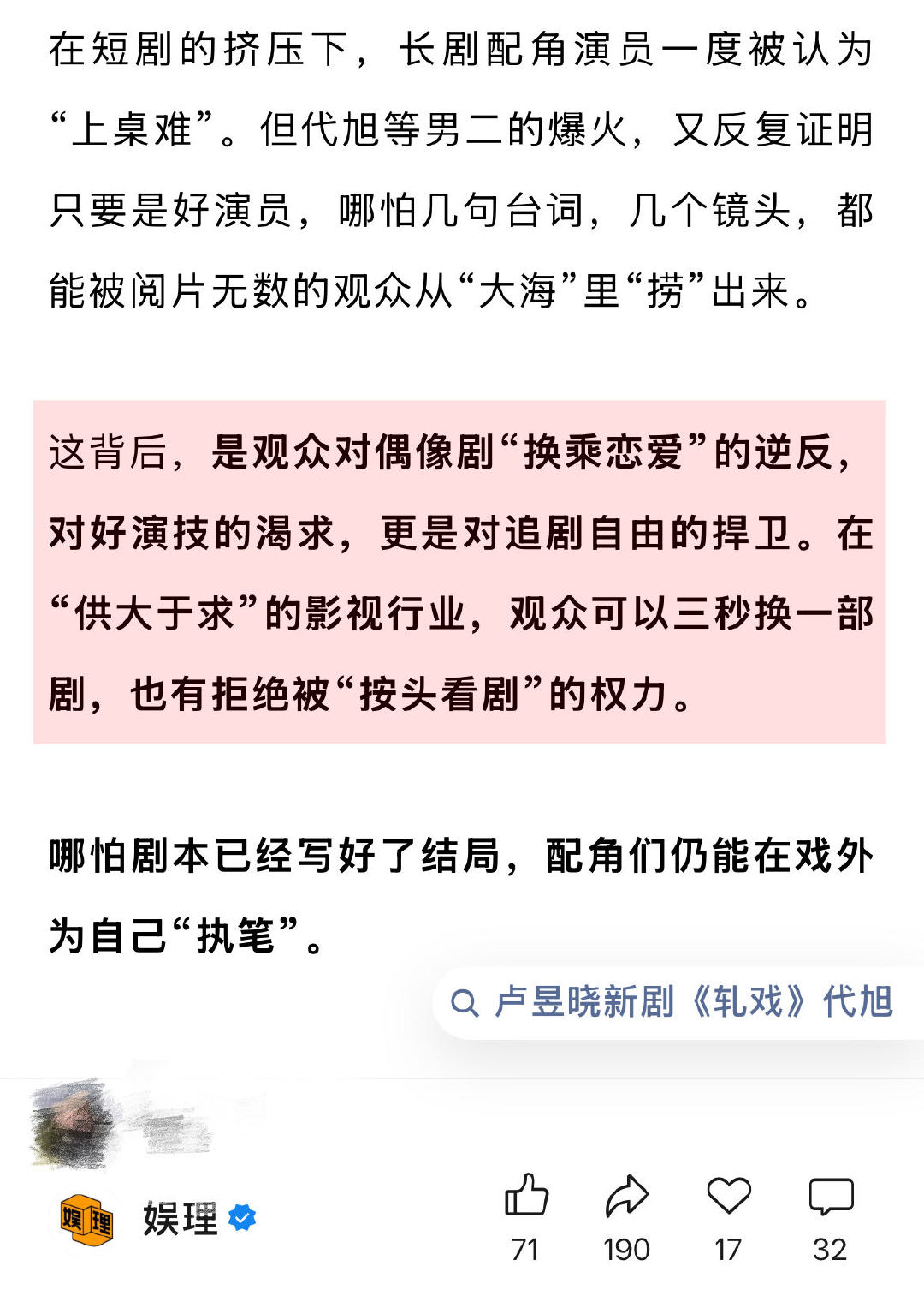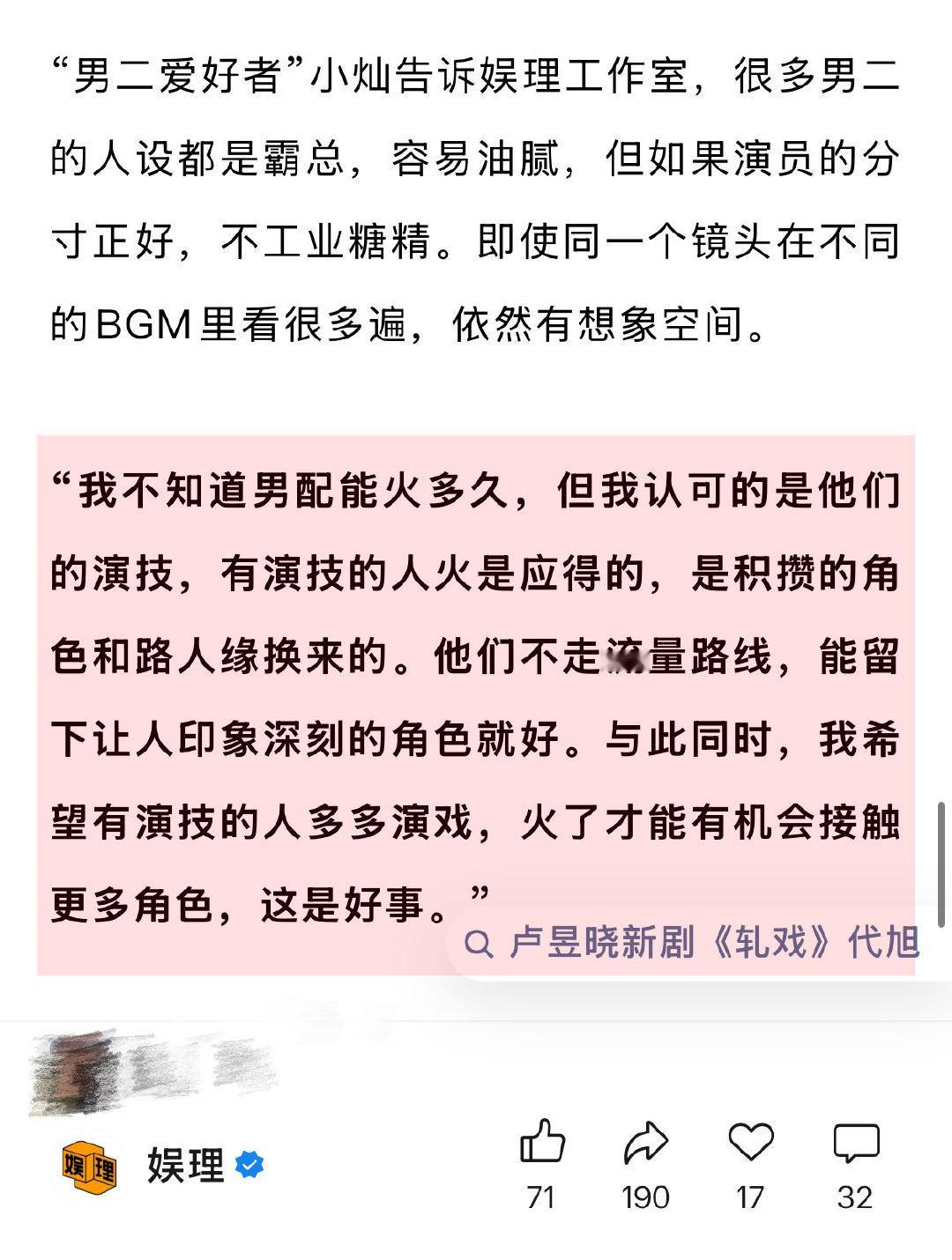 业内谈代旭走红上桌 编剧称很多男配人设比男主讨喜某“男二爱好者”称,很多男二的人设都是霸总,容易油腻,但如果演员的分寸正好,不工业糖精。即使同一个镜头在不同的BGM里看很多遍,依然有想象空间。“我不知道男配能火多久,但我认可的是他们的演技,有演技的人火是应得的,是积攒的角色和路人缘换来的…”娱理独家↓
