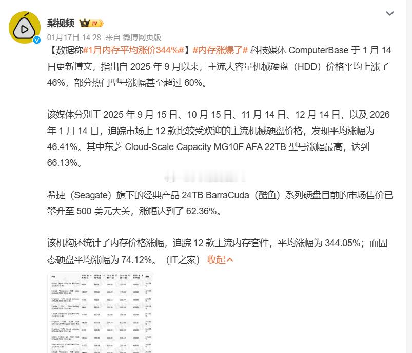内存涨爆了 不仅内存条涨了很多,想买的闪存卡,也涨得飞起2023年买的128G速度U3的闪迪闪存卡,当时99元,今天想再买一张,一看价值,竟然189元了1月内存平均涨价344% ,热点观点