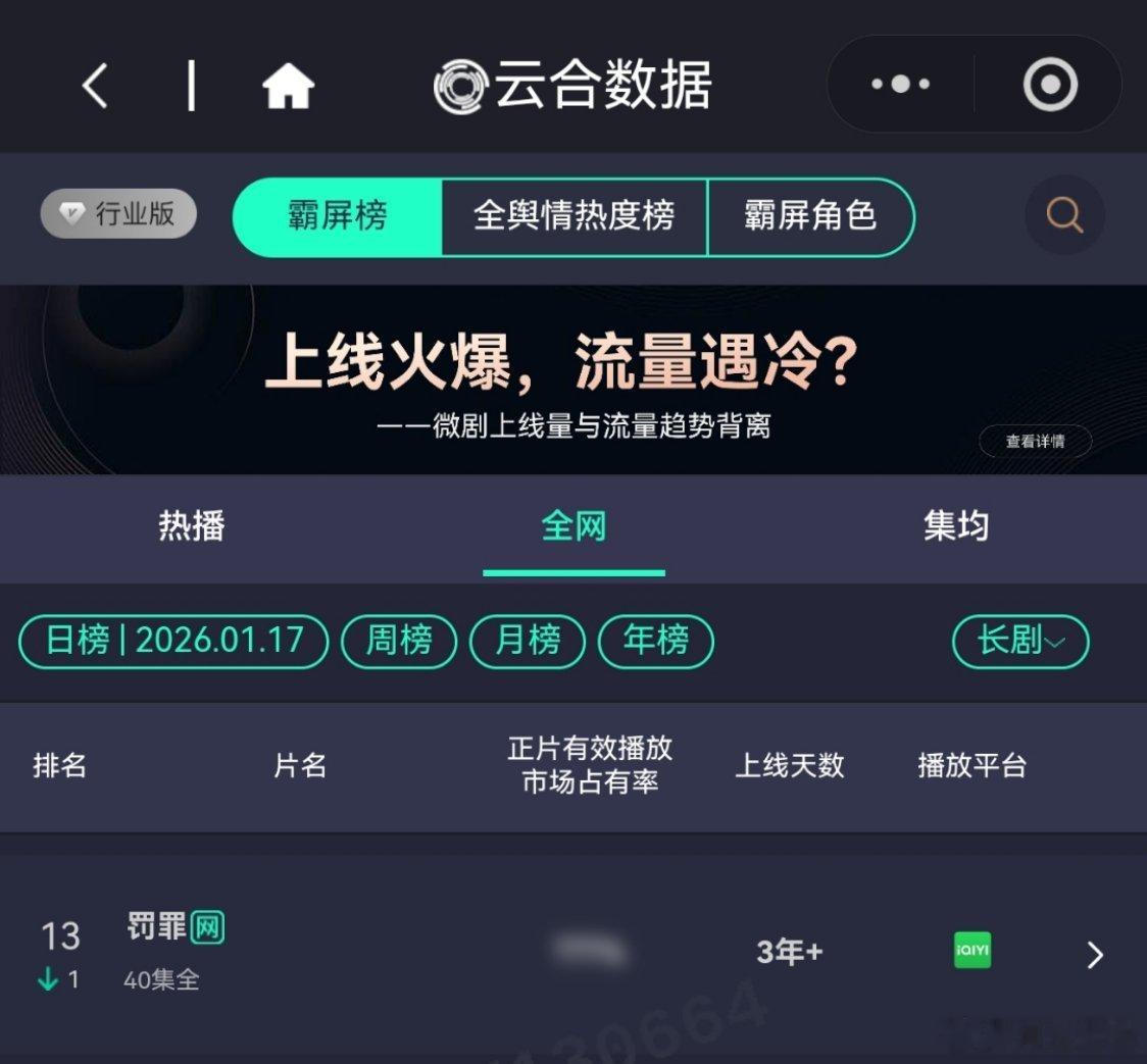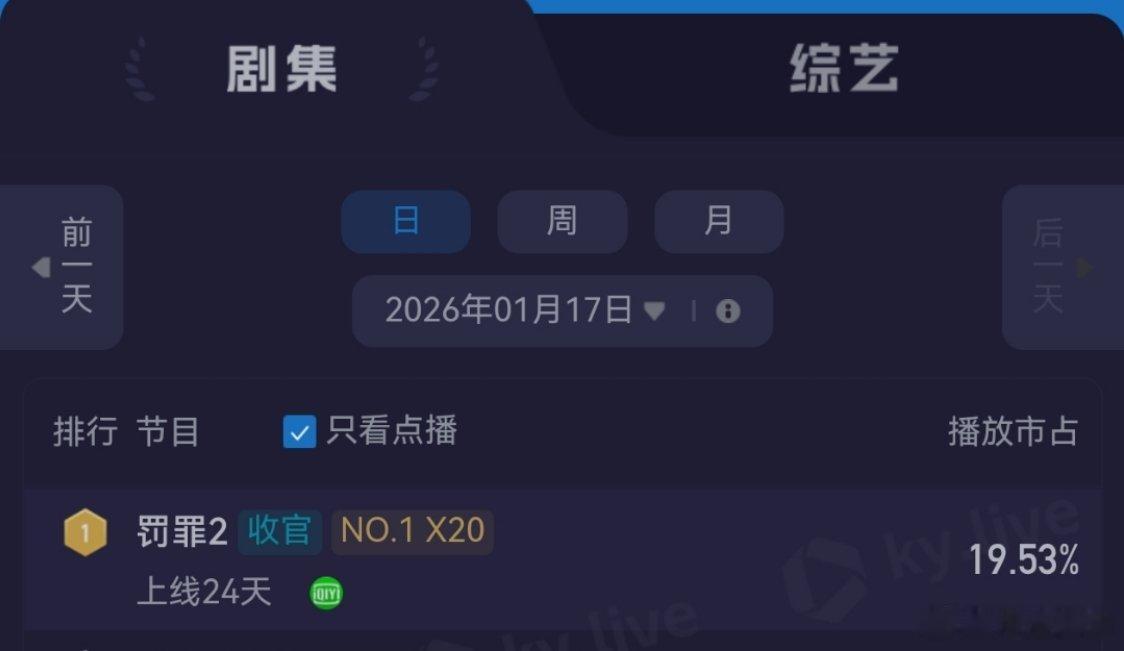 1月17日,罚罪2VIP更新结束罚罪2云合第一罚罪2酷云点播第一罚罪2灯塔第一罚罪,云合第13,《冬至》云合网剧第24,收视率酷云卫视第2,新高。