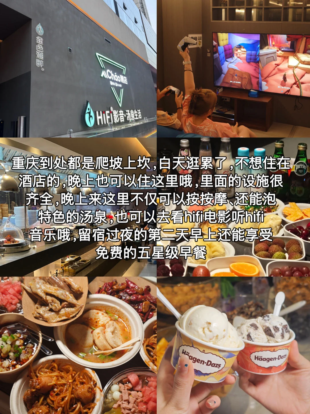 🏨金色湖畔·温泉潮玩生活馆:重庆到处都是爬坡上坎,白天逛累了,不想住在酒店的,晚上也可以住这里哦,里面的设施很齐全,晚上来这里不仅可以按按摩、还能泡特色的汤泉,也可以去看hifi电影听hifi音乐哦,留宿过夜的第二天早上还能享受免费的五星级早餐