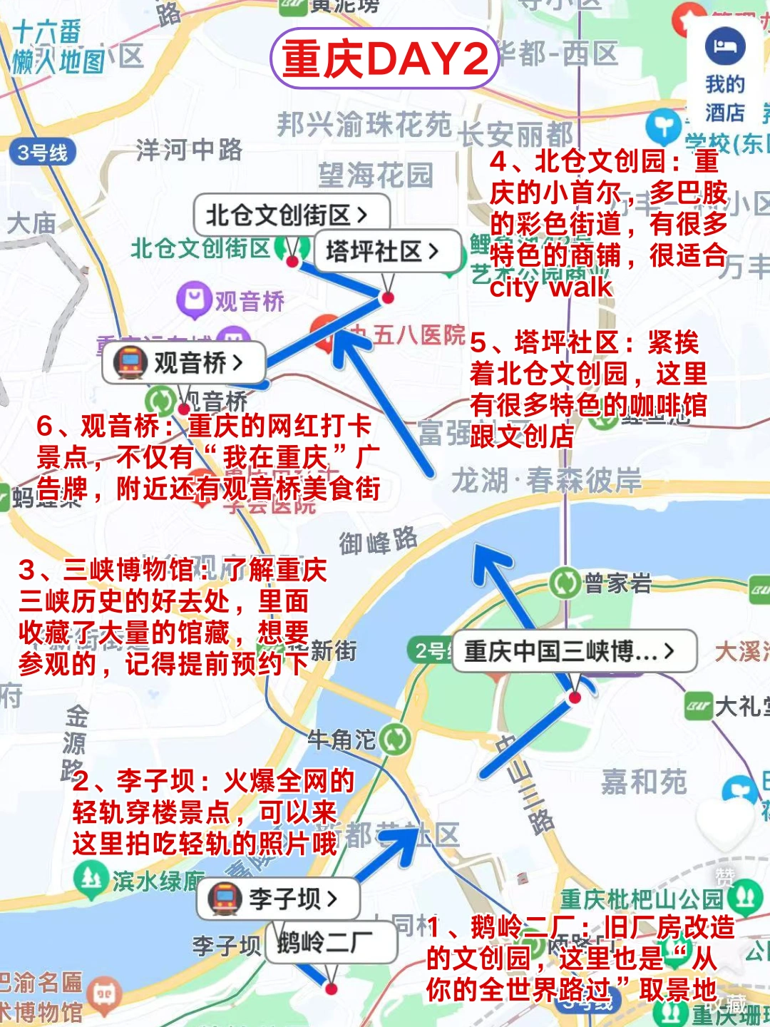 2️⃣DAY2:鹅岭二厂→李子坝→三峡博物馆→北仓文创园→塔坪社区→观音桥