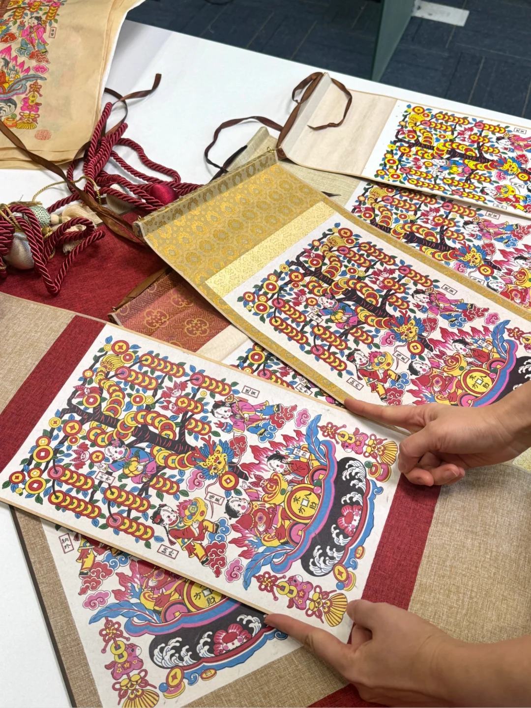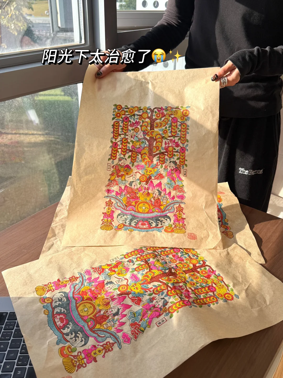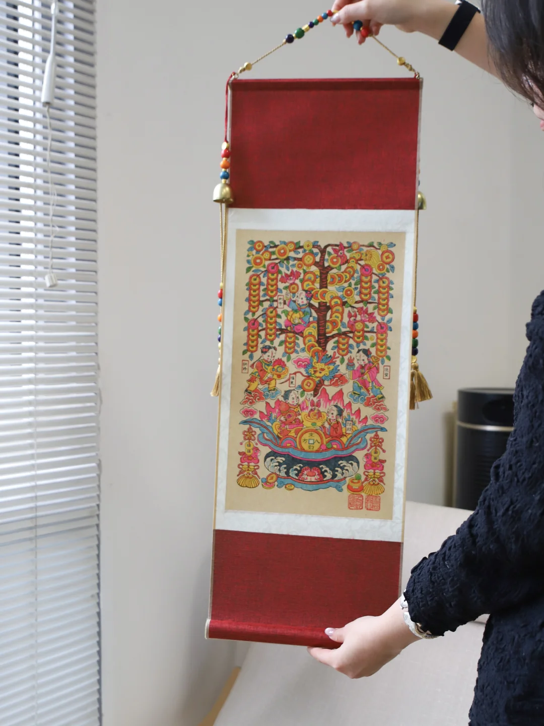 一开始其实我们也没个准 知道成品出来的时候 我们很惊喜 终于有一款更适合现代家居的年画了!! 灰、白、金我们尝试了很多卷轴颜色 最终选择了红色 因为大家对红色的呼声太高了 也符合我们对新年的期望 红红火火但不俗气 画面里有摇钱树、招cai童子 吸纳好运的聚宝盆、铜钱小马... 有着满满的新年感 加入了印金 挂画会在不同的光线下 散发着微微的金光🌟 2026刚出头就已经断货 现在最新一批开始 越晚越没货(真的是实话)