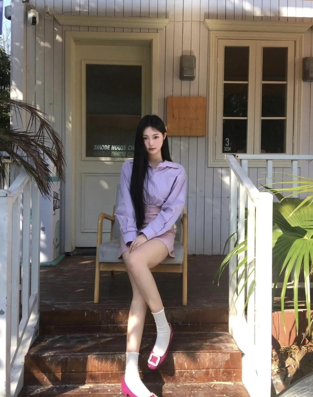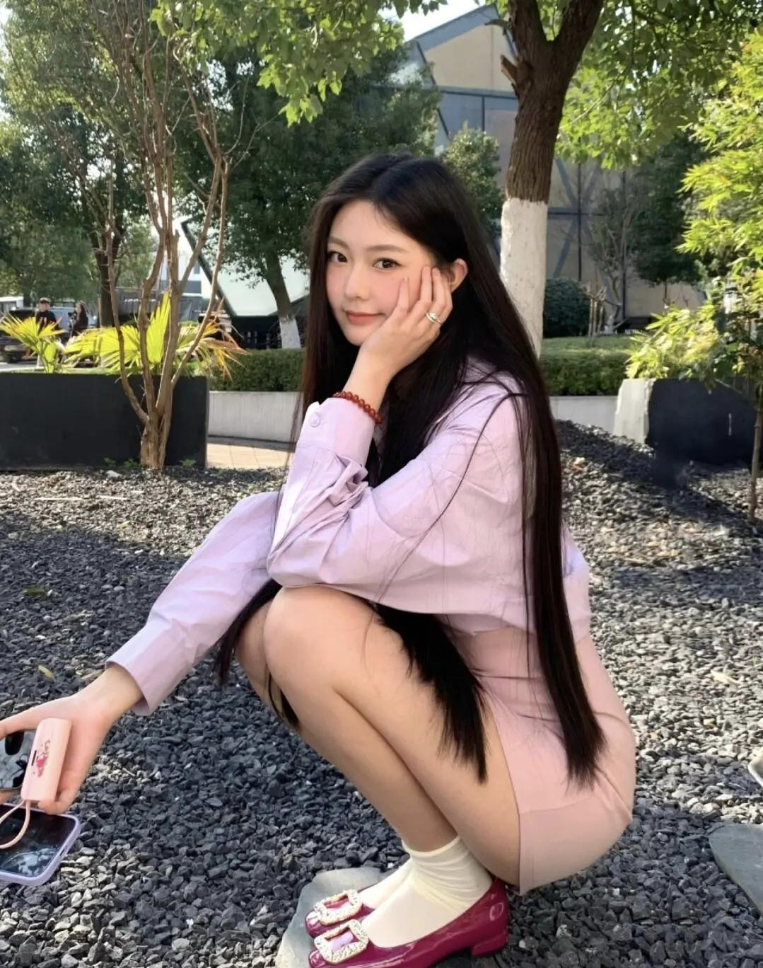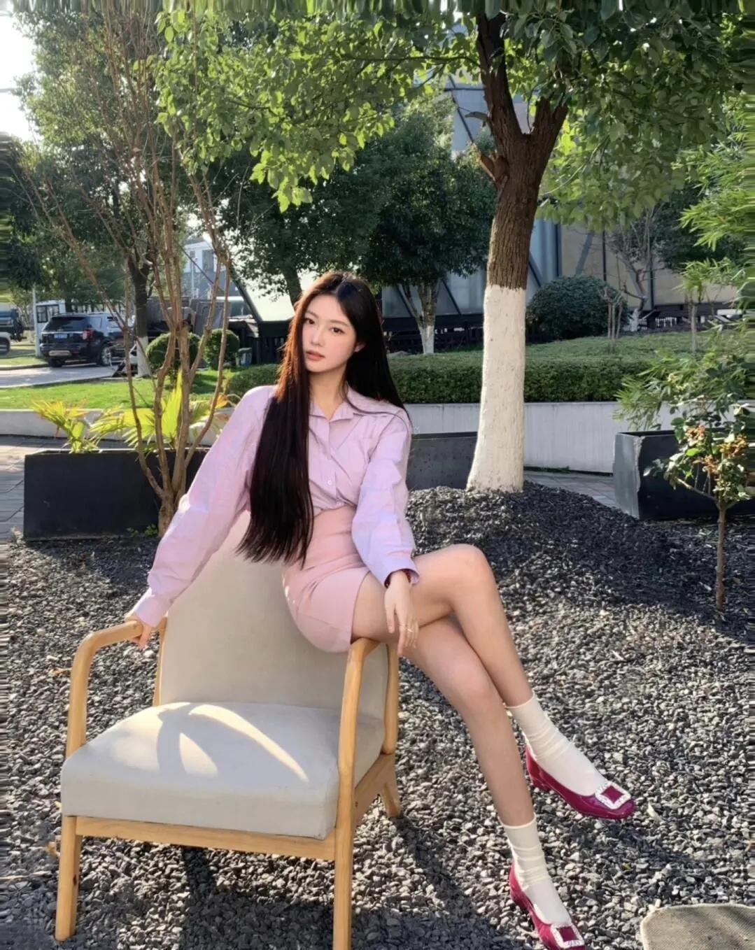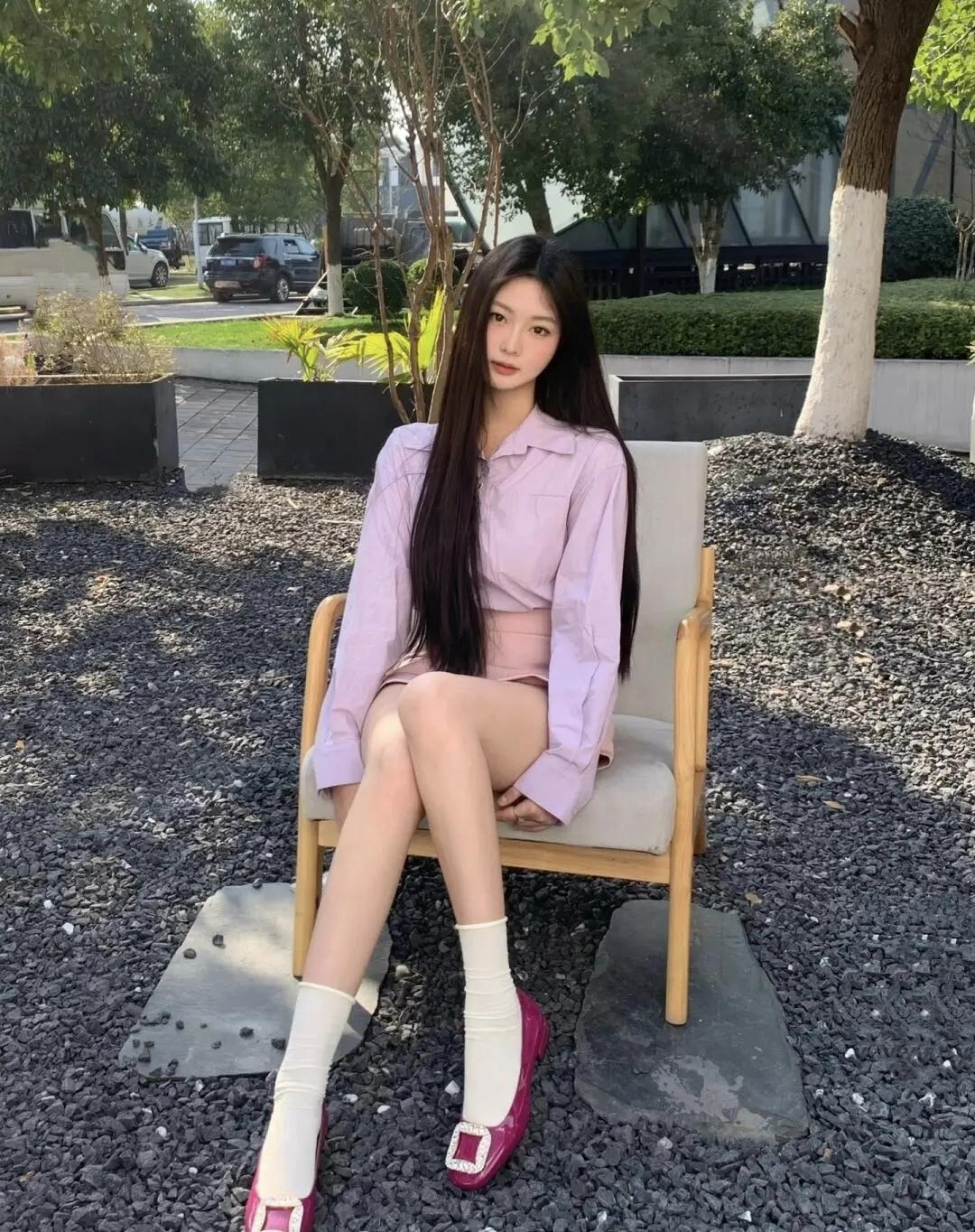 淡紫衬衫揉着温柔的春日氛围,在户外的碎石地面旁闲坐,玫红单鞋撞出点睛的甜酷,让慵懒的时光在微风里慢慢流淌