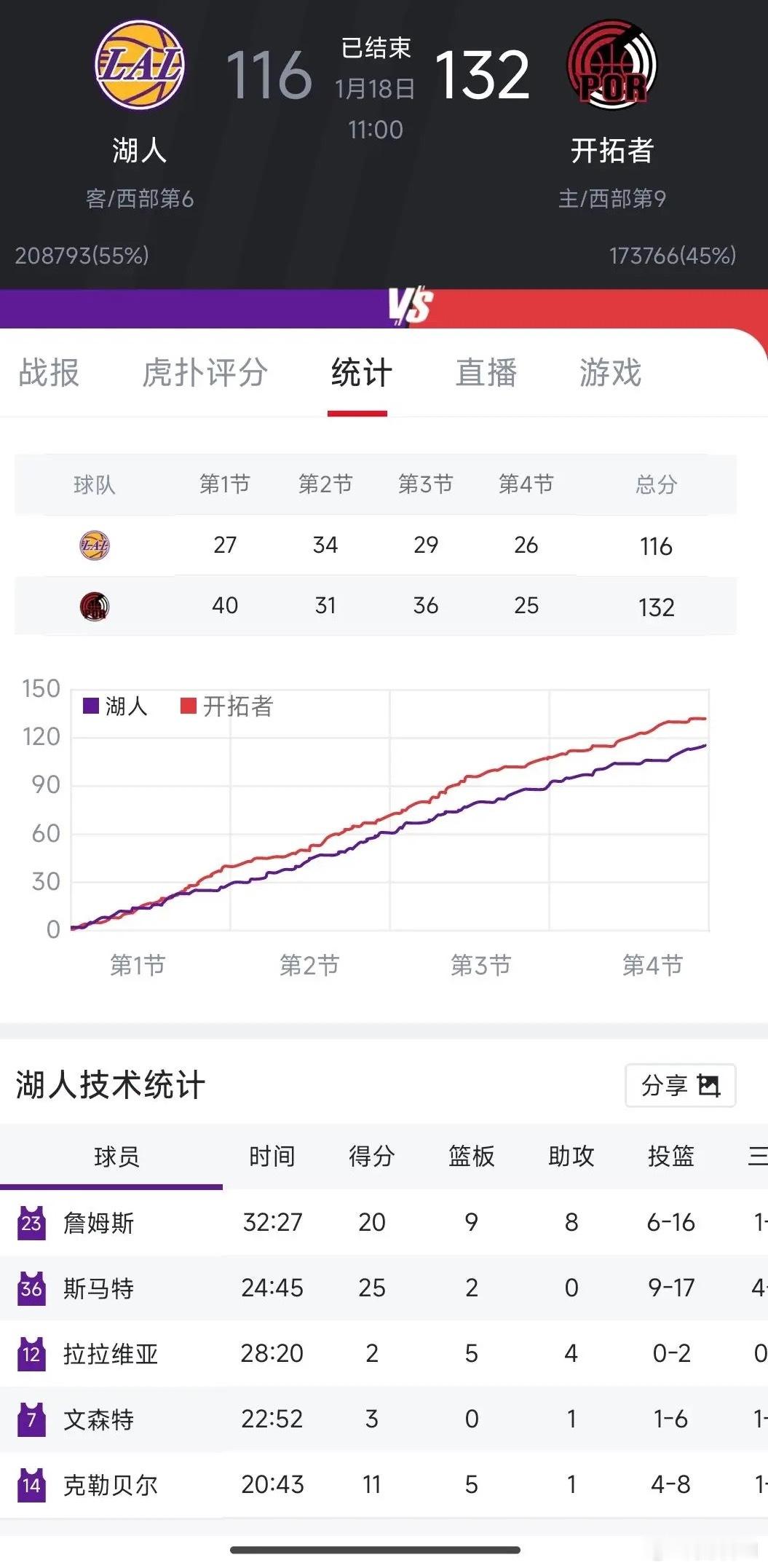 湖人队116:132不敌开拓者,我有2个不可思议1、湖人队首发5人,竟然有2