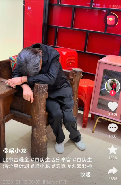 视频中,梁小龙先在凳子上趴了一会,接着他拿着扇子和道具对着镜头正常说着话。