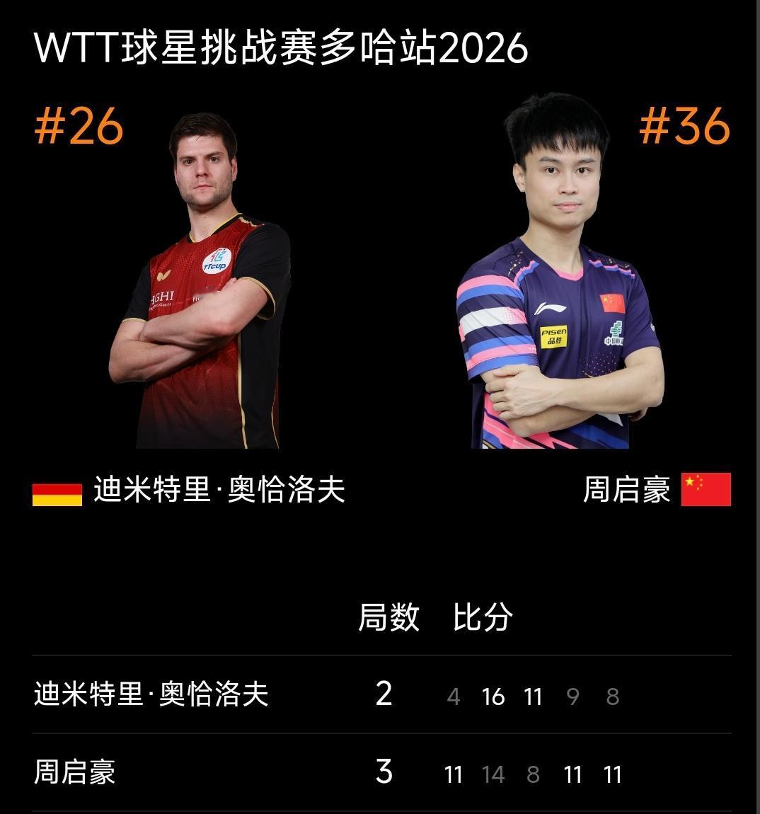 周启豪、温瑞博双双战胜世界冠军敌晋级决赛,国乒提前包揽冠亚军! 多哈球星挑战赛 男单半决赛结束,国乒周启豪3比2战胜世界冠军奥恰洛夫晋级决赛;周启豪在总比分1比2落后的不利局面下连扳两局拿下胜利,可喜可贺! 另一场半决赛,国乒小将温瑞博以大比分3比2战胜世界冠军雨果.卡尔德拉诺晋级决赛,决胜局2分险胜,面对世界冠军,温瑞博在关键分表现更佳,未来大有可为,继续加油!恭喜两位国乒选手! 恭喜国乒提前包揽冠、亚军!